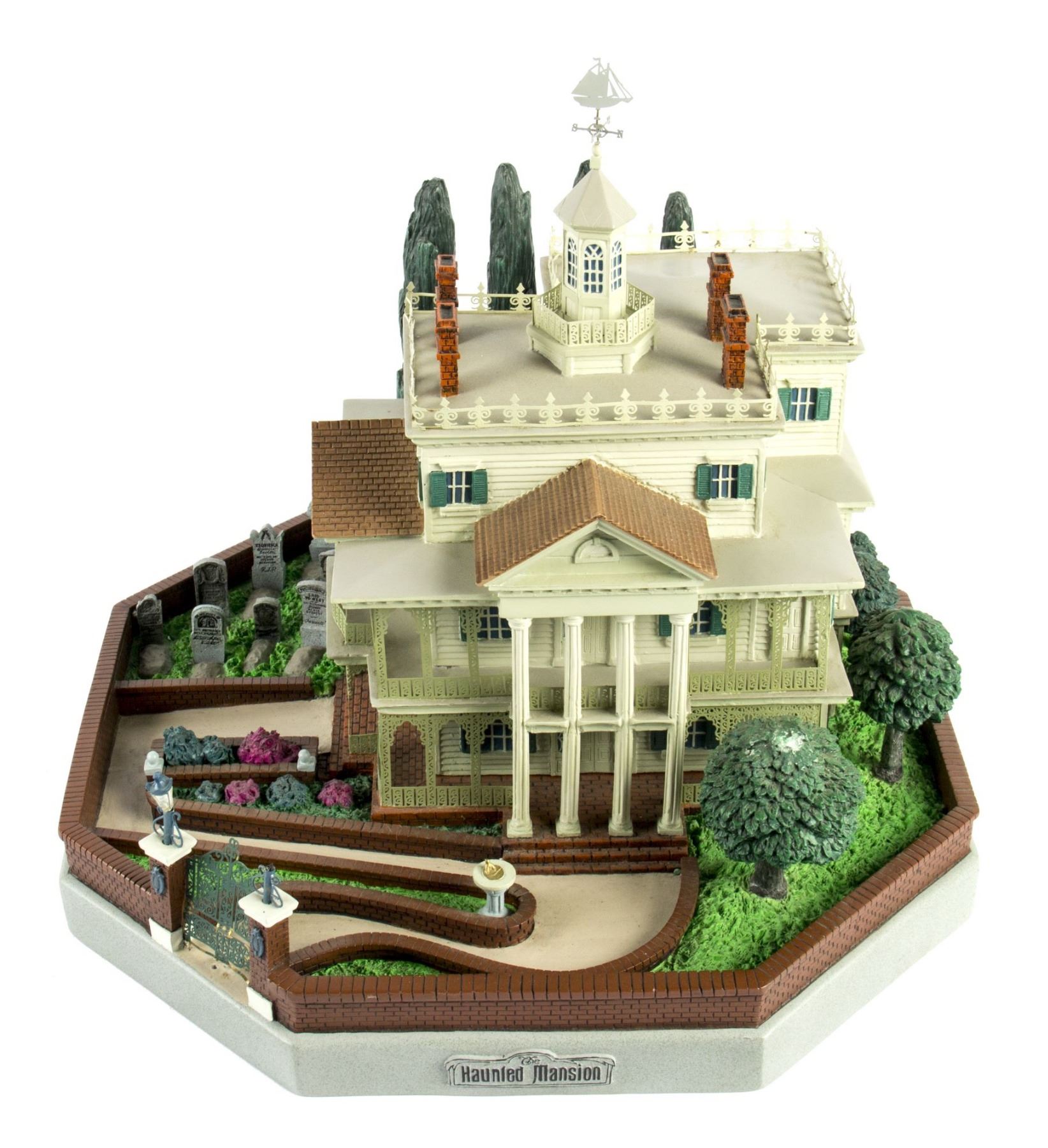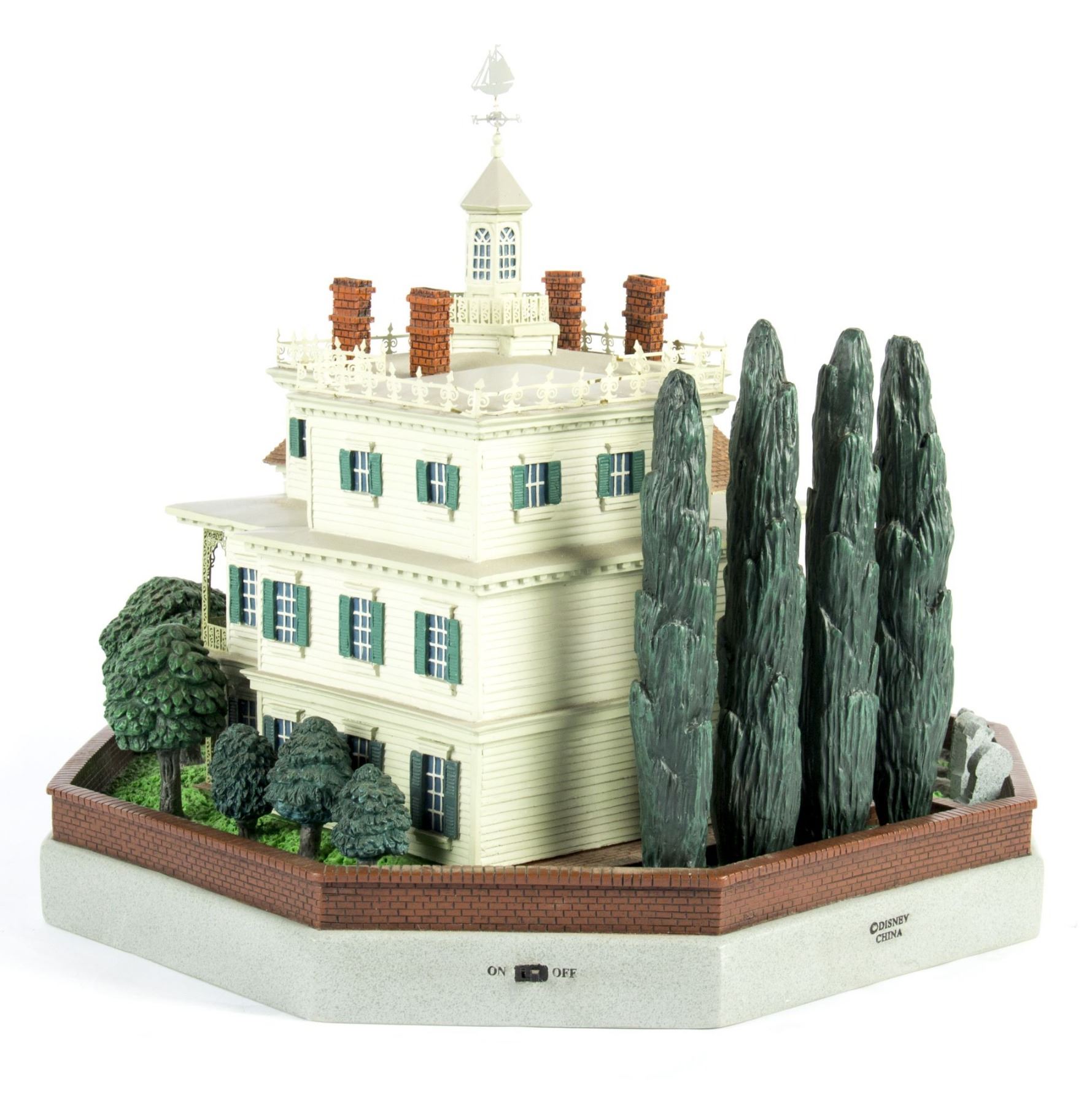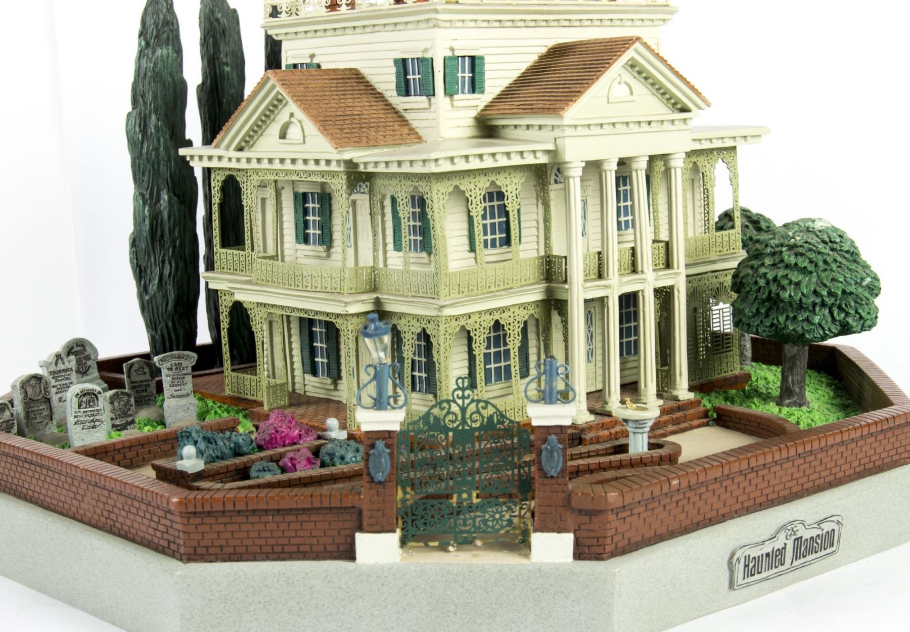 (Disneyland, 2005) A stunning "Magical Big Figurine" created by Larry Nikolai for the 50th anniversary of Disneyland. This "Haunted Mansion" themed Big Fig depicts a small-scale version of the attraction including a small graveyard. It is battery-operated with lights throughout and sounds that play when some of the tombstones are pressed. This "Big Fig" measures approximately 16" in diameter and 14" tall, the condition is fair with some wear throughout including mild bending to some of the metal railings and a few broken pieces.