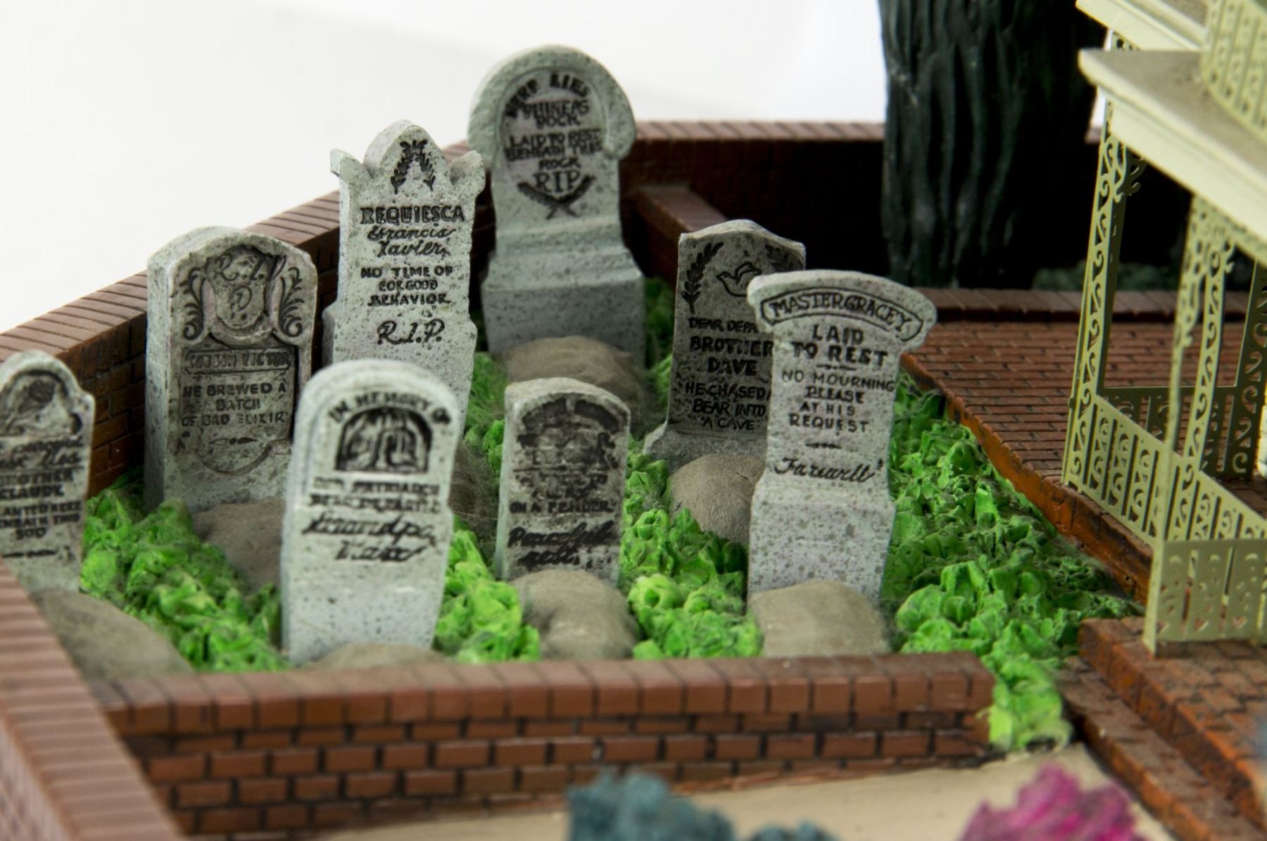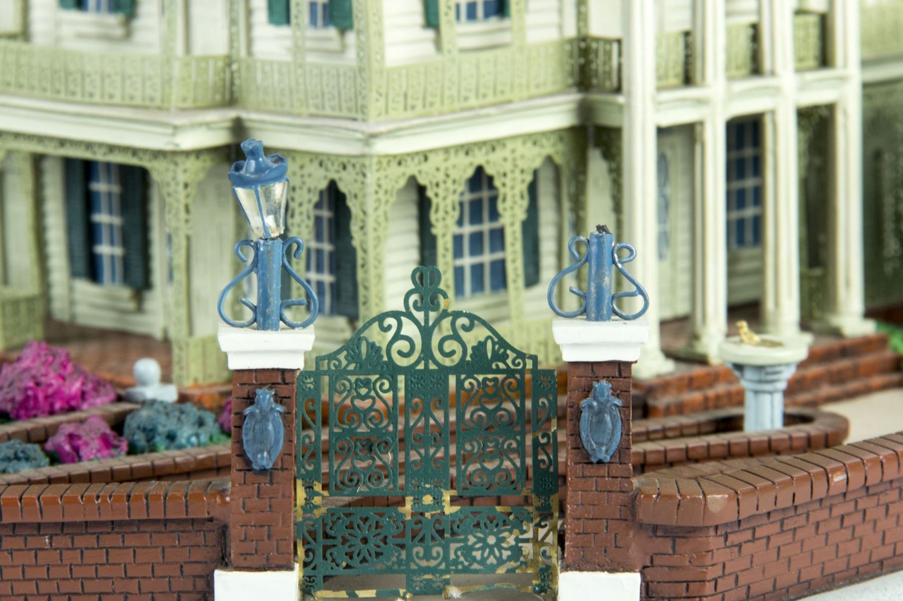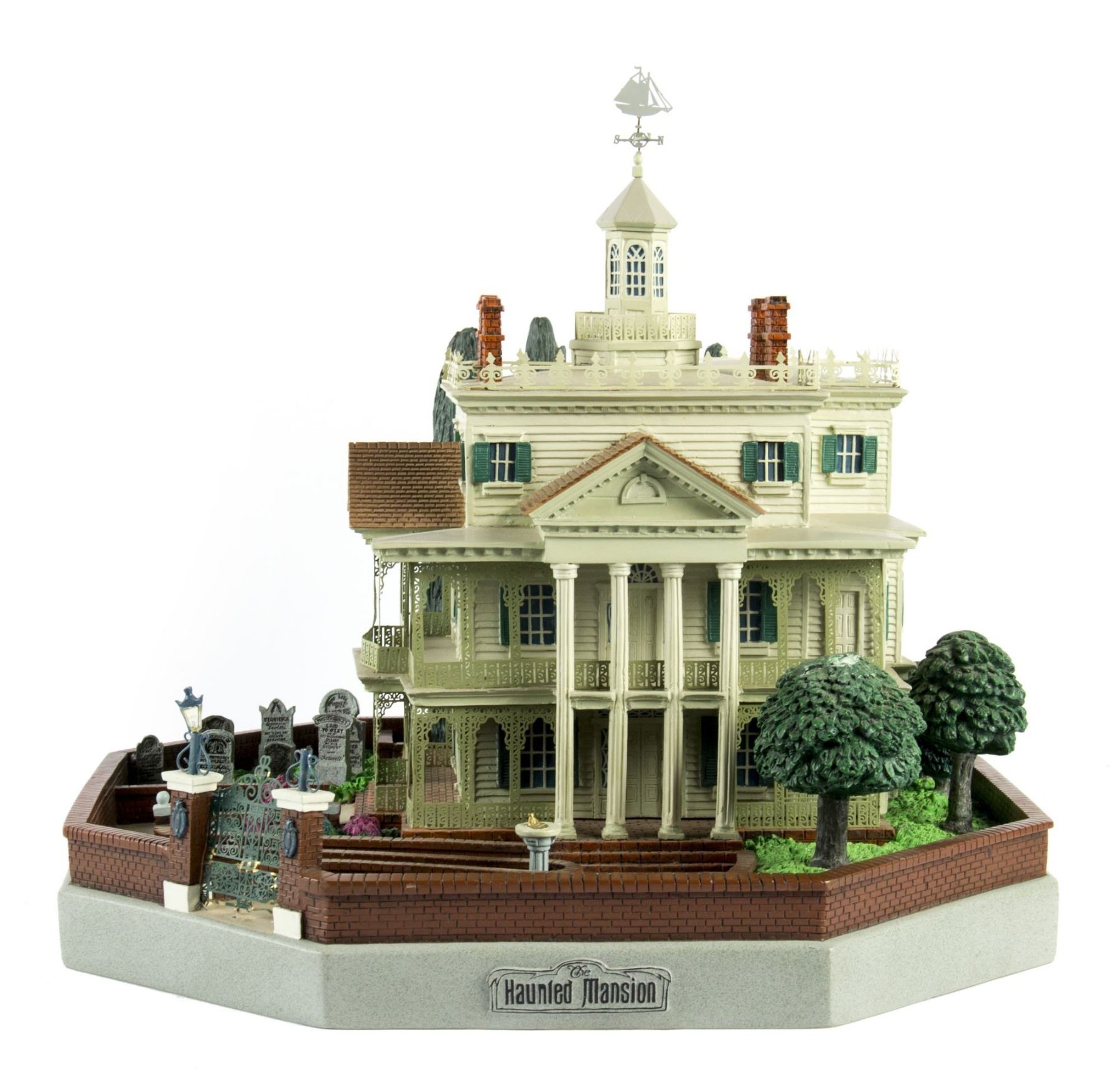 (Disneyland, 2005) A stunning "Magical Big Figurine" created by Larry Nikolai for the 50th anniversary of Disneyland. This "Haunted Mansion" themed Big Fig depicts a small-scale version of the attraction including a small graveyard. It is battery-operated with lights throughout and sounds that play when some of the tombstones are pressed. This "Big Fig" measures approximately 16" in diameter and 14" tall, the condition is fair with some wear throughout including mild bending to some of the metal railings and a few broken pieces.