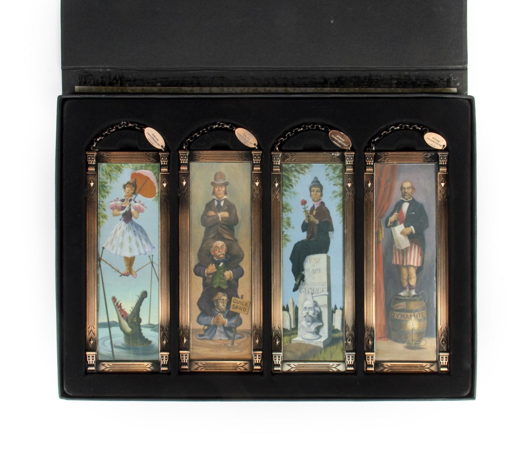 (Disneyland, 2009) A very rare limited edition boxed set of all four framed glass stretching portraits from Disneyland's "Haunted Mansion". Created for the 40th Anniversary of the attraction in an edition of only 500, each glass portrait measures 8.5"x3.5" and comes with a chain hanger with a tag that says "40th Anniversary Haunted Mansion". The set comes in a stylish 12"x17" box with the logo for the anniversary on the lid. The set is in very good condition with minor wear to the box.