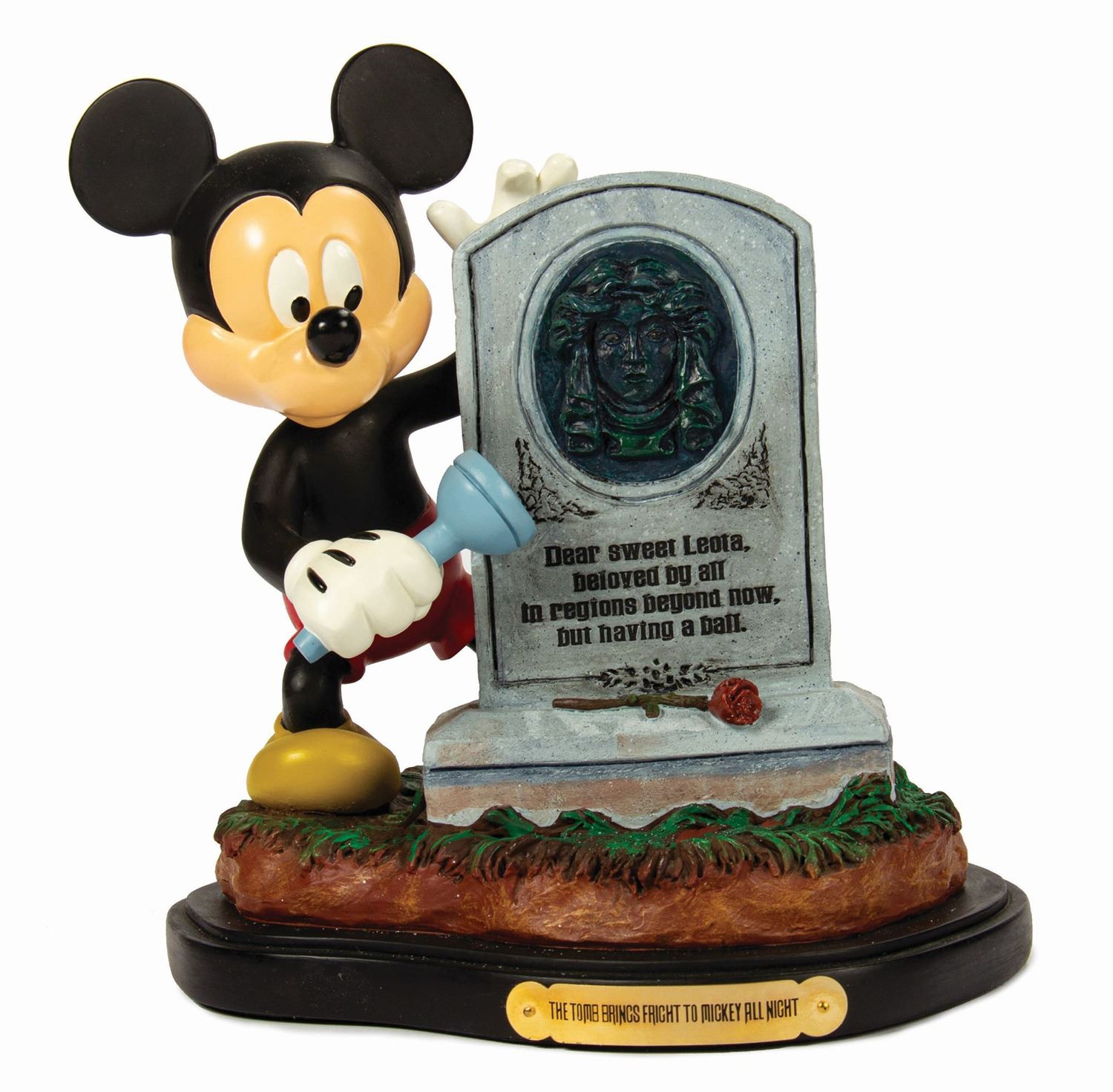 (Walt Disney World, 2003) A bobblehead figure of Mickey Mouse by Madame Leota's tombstone. Limited to only 500 pieces, the figure lights up at Mickey's flashlight and Madame Leota's eyes, and plays a screaming sound when turned on. Measuring 8.75" tall on the 6.25"x8" base, the condition is very good with some surface wear to the black paint. The figure is still functional.