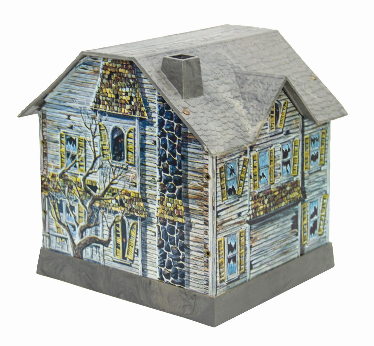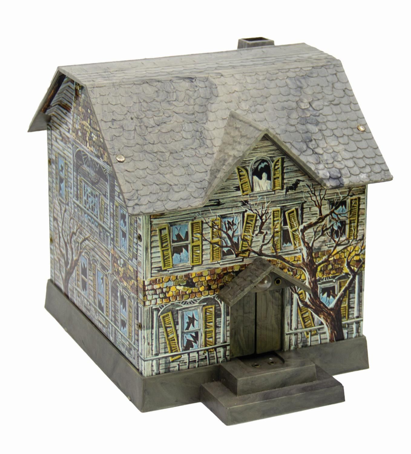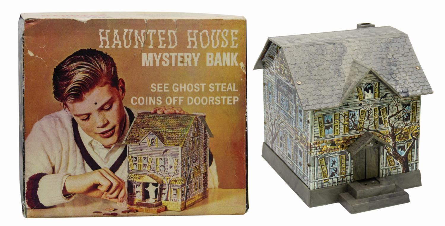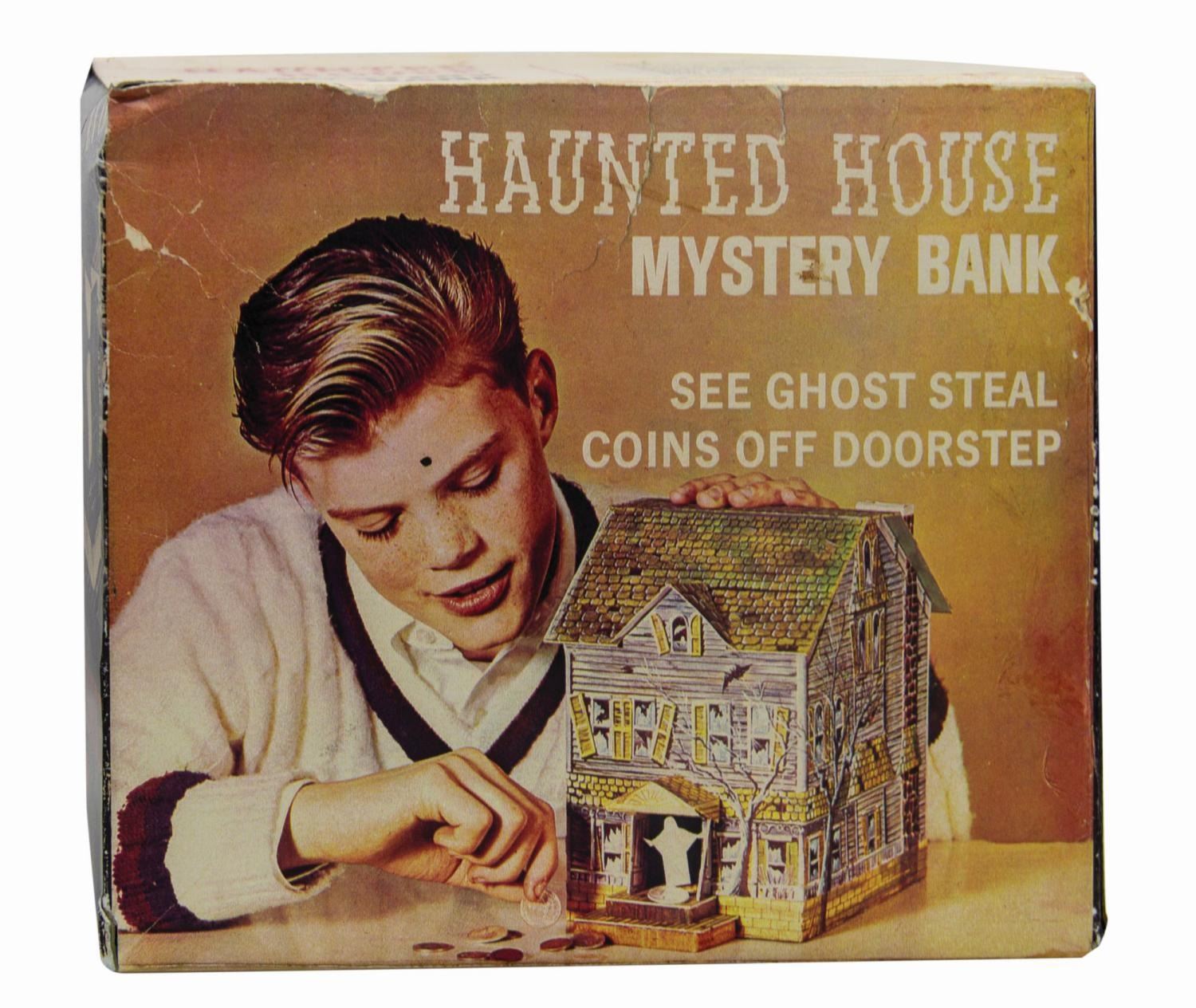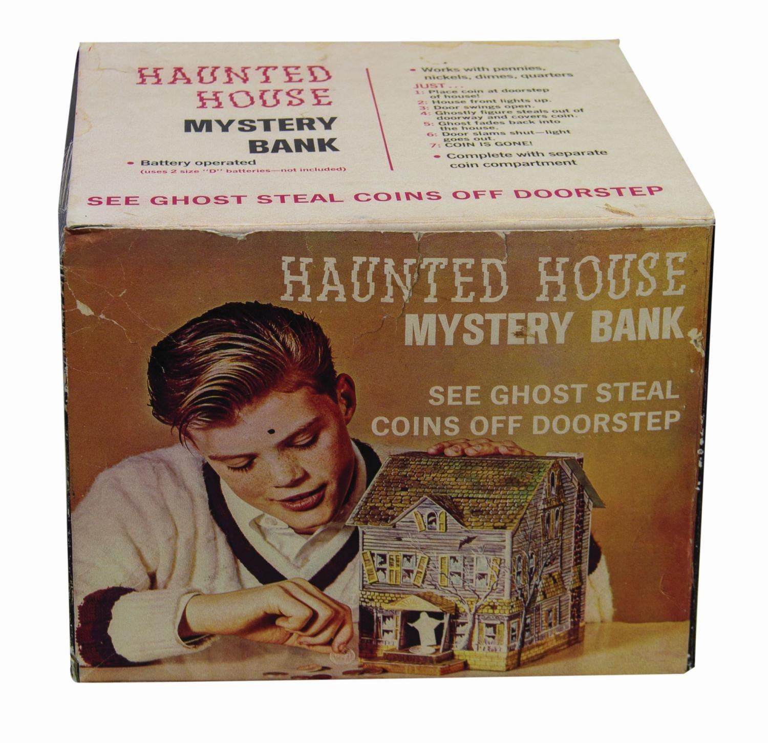 (Disneyland, c.1969) A vintage Haunted Mansion electronic tin lithographic coin bank. These banks were sold at a kiosk outside the Mansion in the 1960s and 70s, even before the attraction opened in August '69. Placing a coin on the front porch creates a circuit that illuminates a light bulb and activates a motorized ghost figure, which slides through the front doors and snatches the coin. The bulb appears to have burned out and the ghost is frozen in the "out" position. Measuring approximately 7.5"x 7" and 8.75" deep, the bank is in very good condition with only minor wear to the bottom edge of the base. The original cardboard box packaging is included, which measures 7.75"x9.25" and 7" deep and exhibits some minor creasing, tears, and spot soiling.