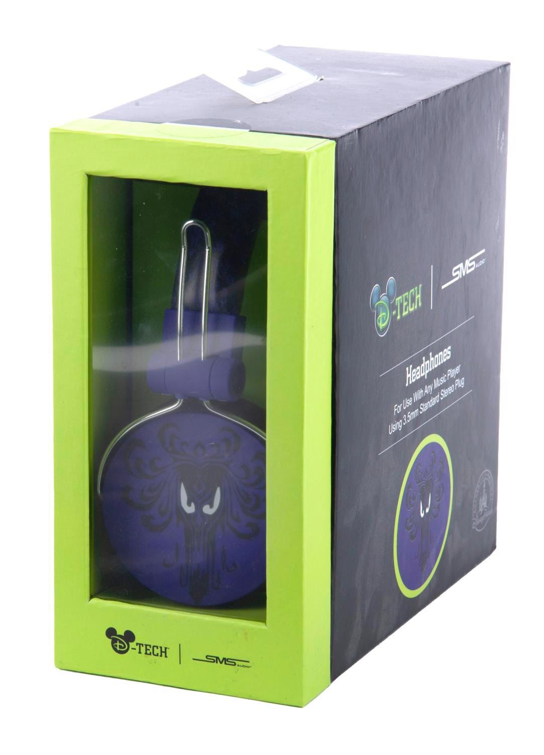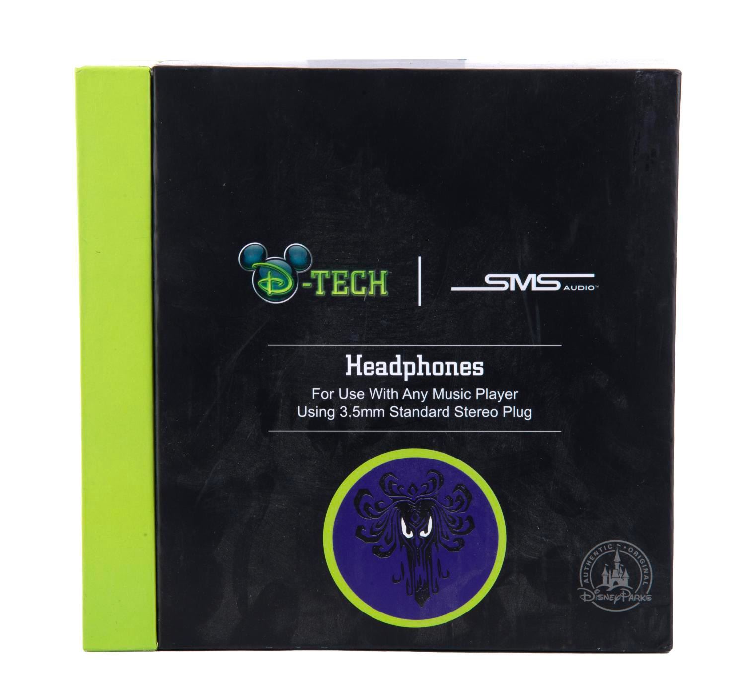 (Disney Parks, 2020) A rare Disney Parks Headphones with Haunted Mansion demon wallpaper motif by D-Tech & SMS Audio. The headphones have padded ear cups, are compatible with any music player using a 3.5mm standard stereo plug, and are in fine unused condition in original package.
