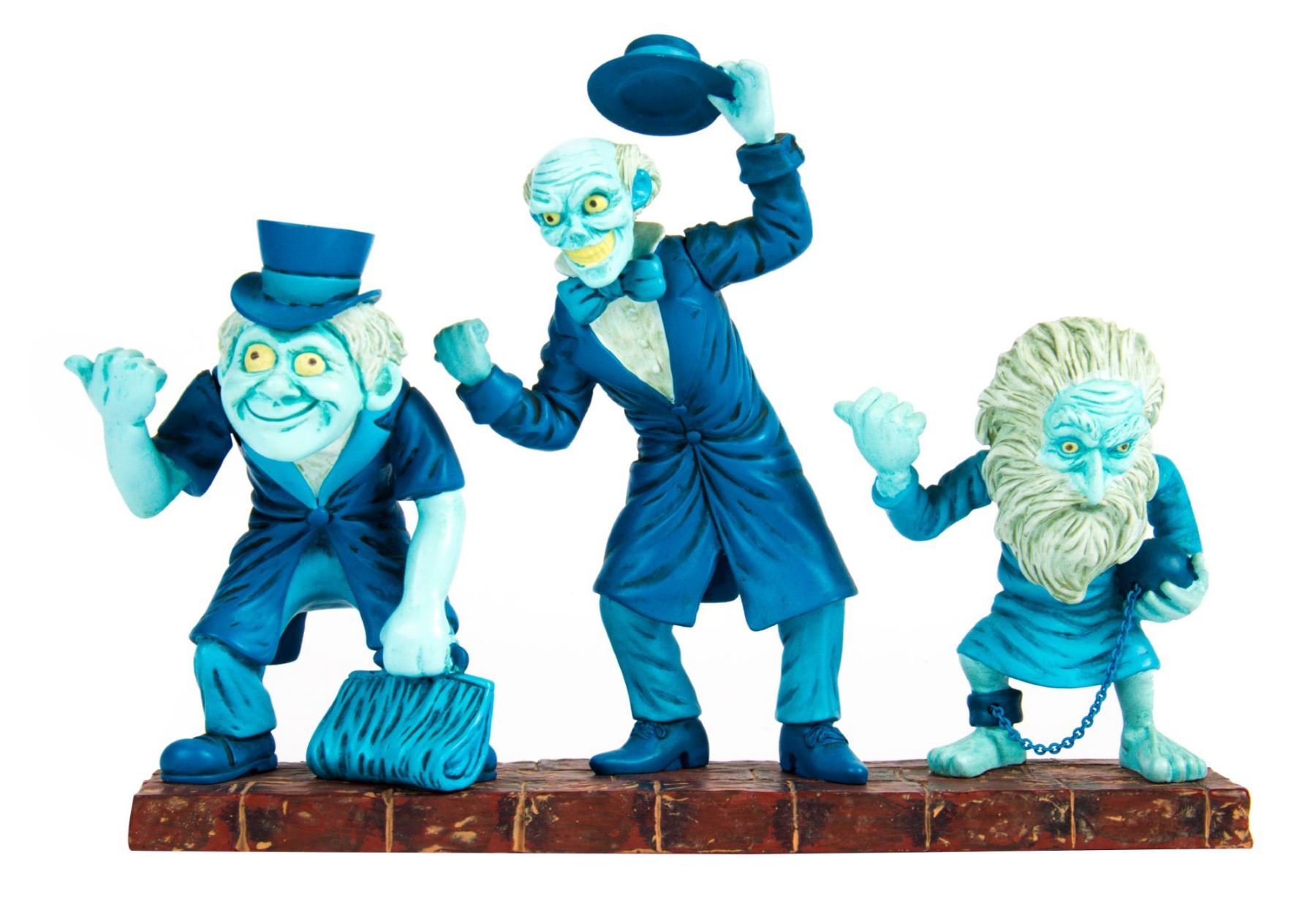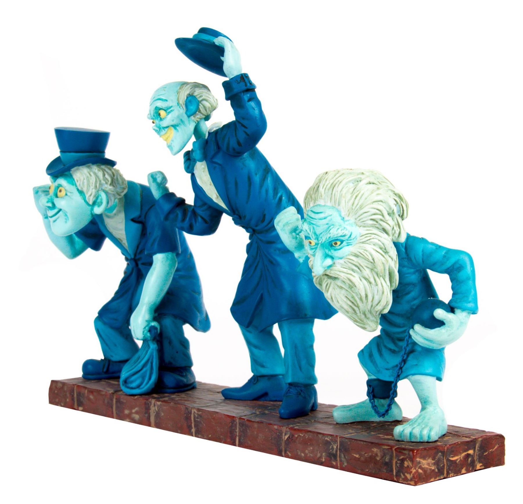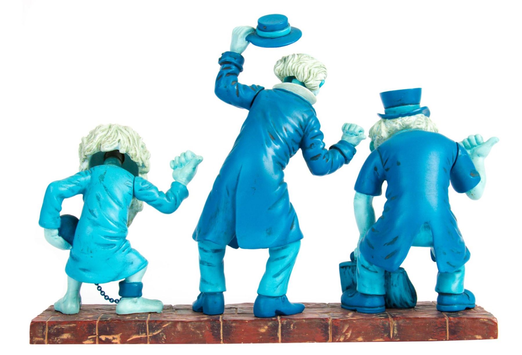 (Disneyland, c.2000s) A bobblehead figure of the three Hitchhiking Ghosts from the "Haunted Mansion". The heads bobble on all three characters, and the figure is accomplished in metal and resin. The figure measures approximately 7"x10" and is in very good condition with little wear.