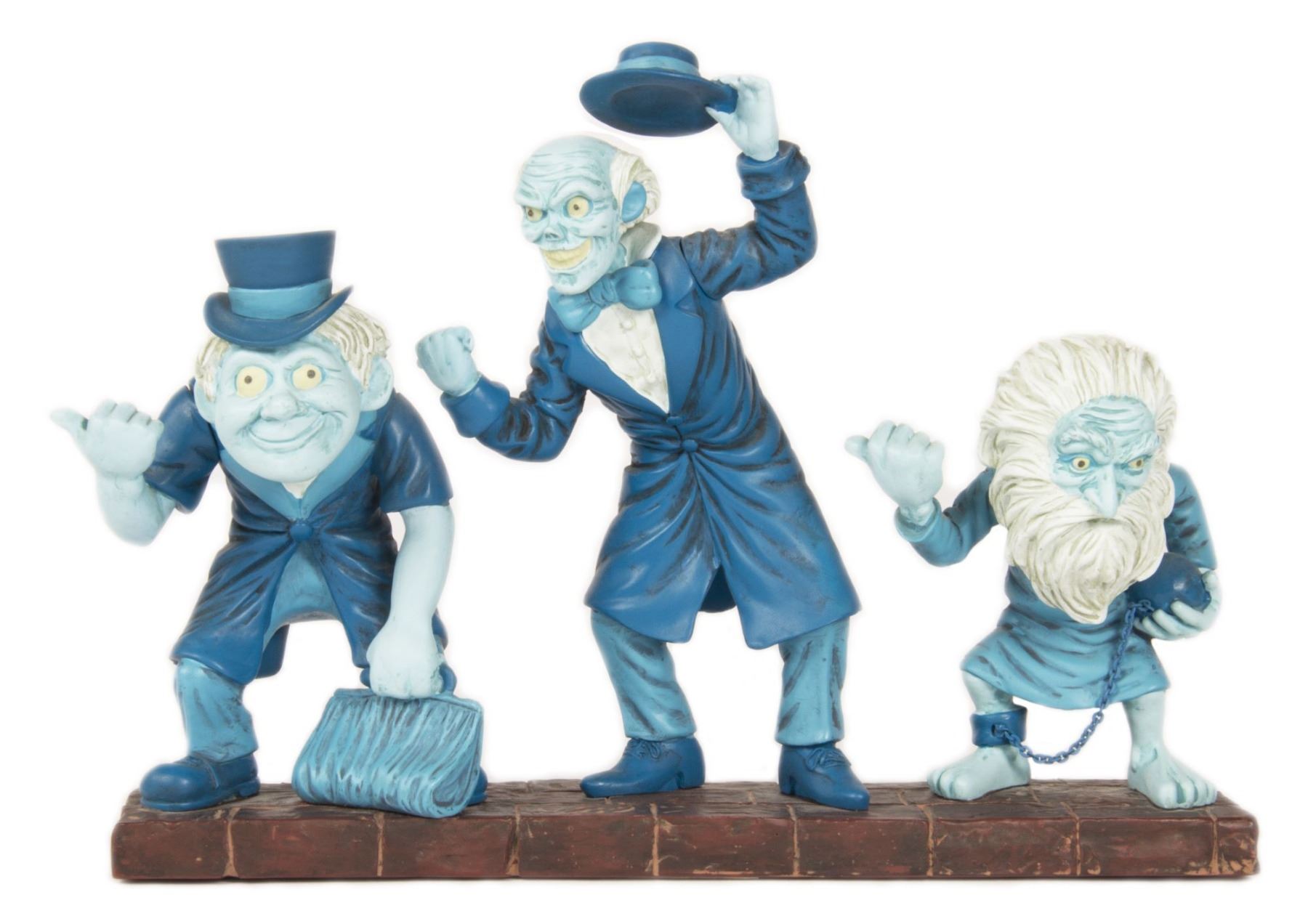 (Disneyland, 2000s) A charming triple bobblehead figure of the Hitchhiking Ghosts from the Haunted Mansion. All three resin figures are adhered to the same base and have bobbling heads, and the center ghost has a bobbling arm. Measuring 7" tall and 9.5" long, the bobblehead is in very fine condition with minor wear.