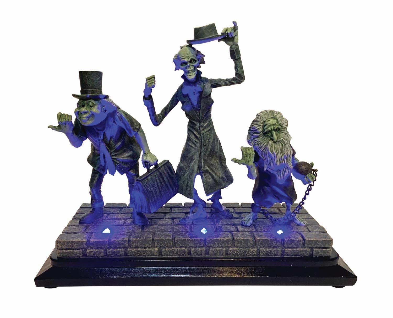 (Disneyland, 2019) A sculpture of the Hitchhiking Ghosts designed by Costa Alavezos and Tony Cipriano to celebrate the 50th anniversary of Disneyland's Haunted Mansion. Constructed of cast resin, the piece depicts Phineas, Ezra, and Gus on a pathway with an integral base. A slider switch on the reverse activates blue LED lights in the base, which illuminate each of the figures. The base contains the battery compartment, and the electronics are in working order. The original packaging is included. Measuring 8"x10" and 3.75" deep, the piece is in very fine condition with minimal wear. The box measures 11.25"x13.25" and 6.5" deep and exhibits surface loss and corner jamming.