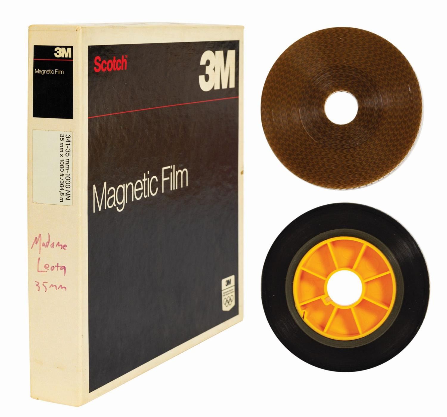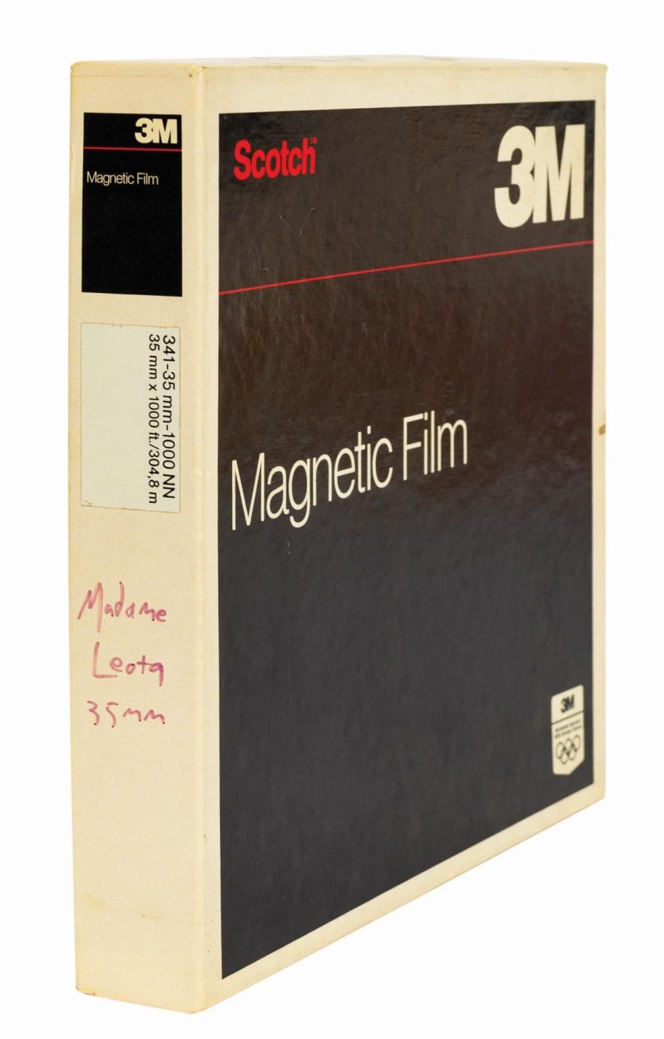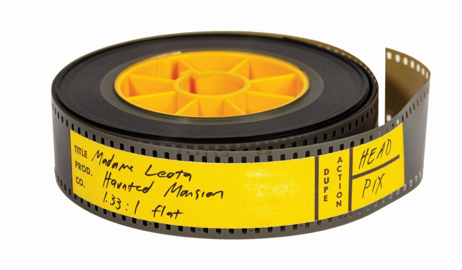 (Disneyland, 1969) An extremely rare 35mm film print made from the archived negative of the footage used to create the Madame Leota disembodied head in a crystal ball special effect for Disneyland's Haunted Mansion. The medium Madame Leota is played by Imagineer Leota Toombs (who is also the character's namesake). A complicated shoot, Toombs lip-synched to prerecorded dialog by voice actress Eleanor Audley, and had to be filmed while lying down to keep as still as possible, as any pronounced movements would have caused a distortion in the process by which her face was projected on the crystal ball, spoiling the effect. This print was made by a former Imagineer for their personal archive. Also included is a 35mm recording of selections of audio from the attraction, including the Madame Leota vignette. The film reel measures approximately 5" in diameter, and retains a label marked, "Madame Leota Haunted Mansion 1.33:1 flat." The film is in very good condition with some minor surface wear and hairline scratches.