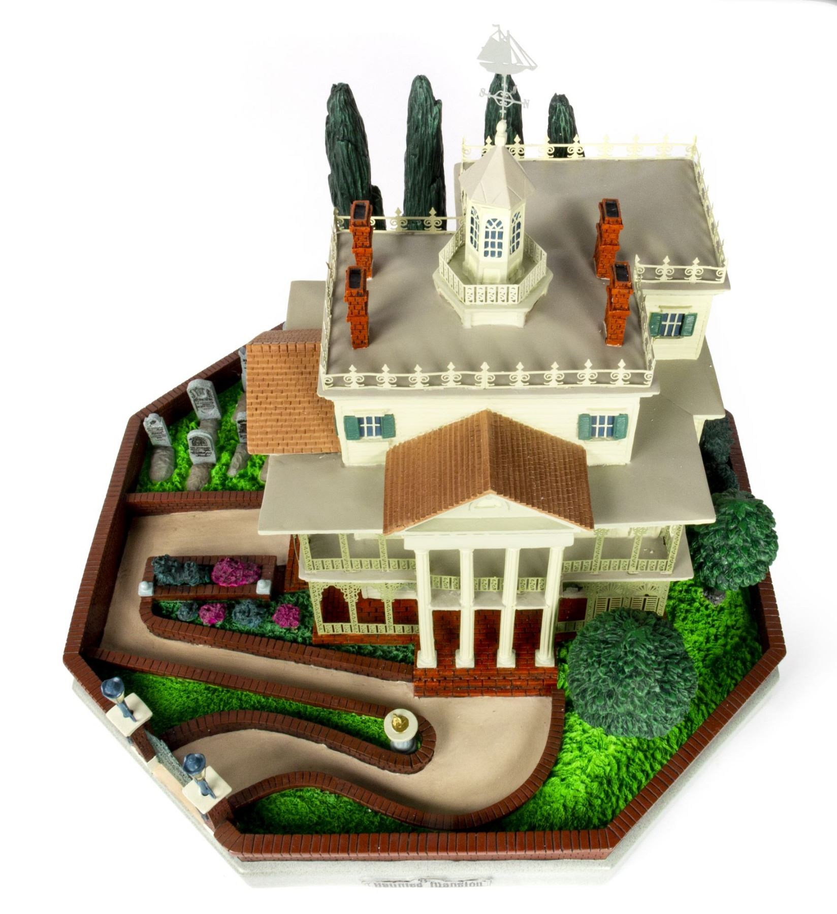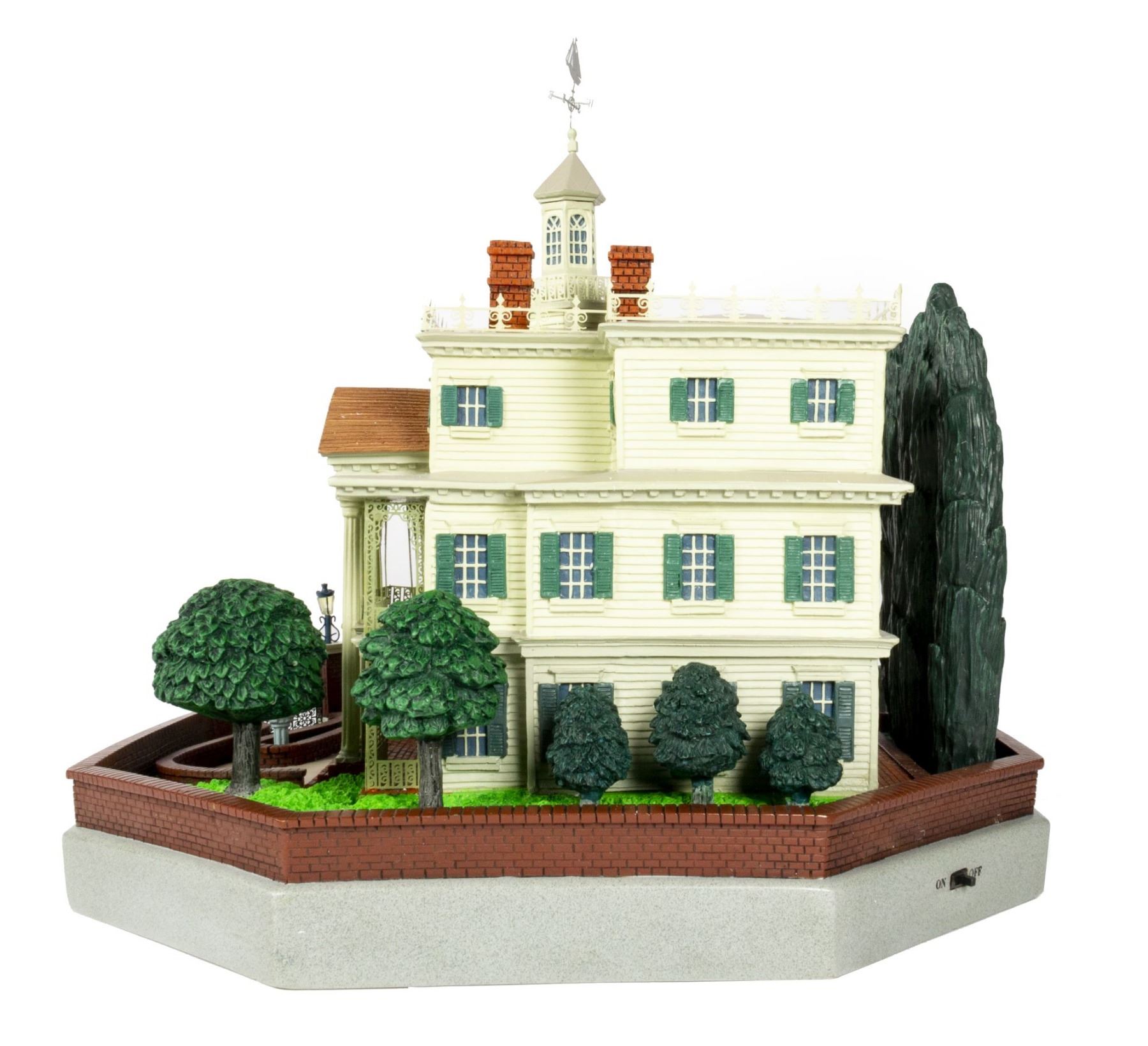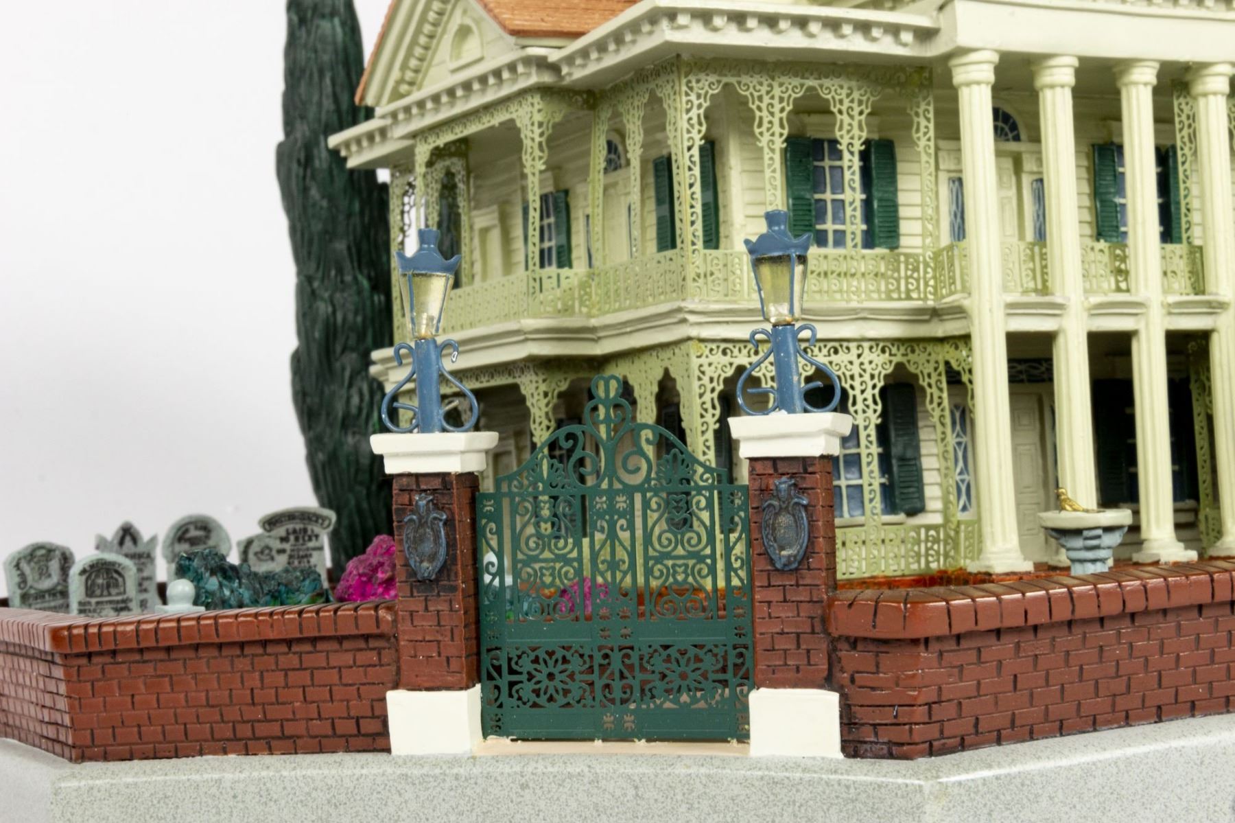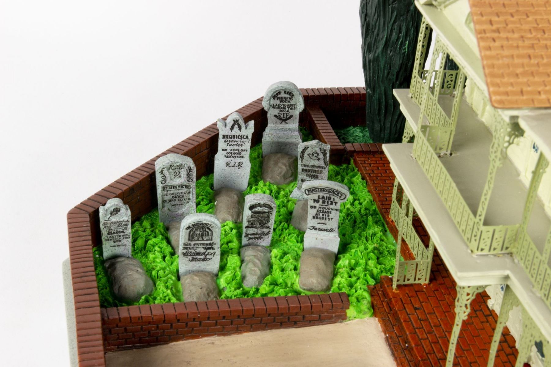 (Disneyland, 2004) A stunning Magical Big Figurine created by Larry Nikolai for the 35th anniversary of the Haunted Mansion. This "Big Fig" depicts a small-scale version of the attraction, including a small graveyard. The figure is battery-operated, with lights throughout and sounds that play when some of the tombstones are pressed. Measuring approximately 16" in diameter and 14" tall, the figure is in very fine condition.