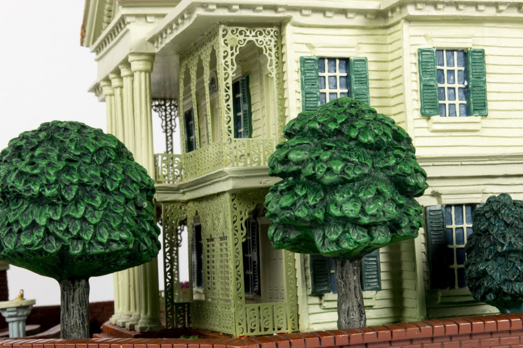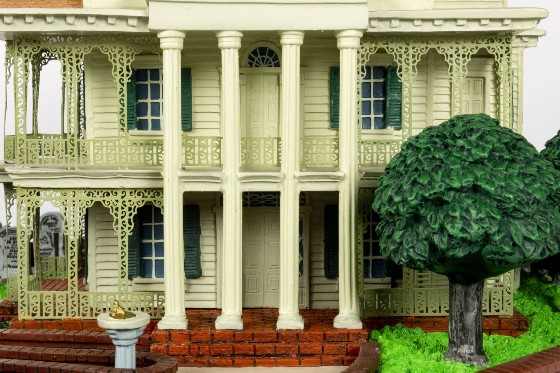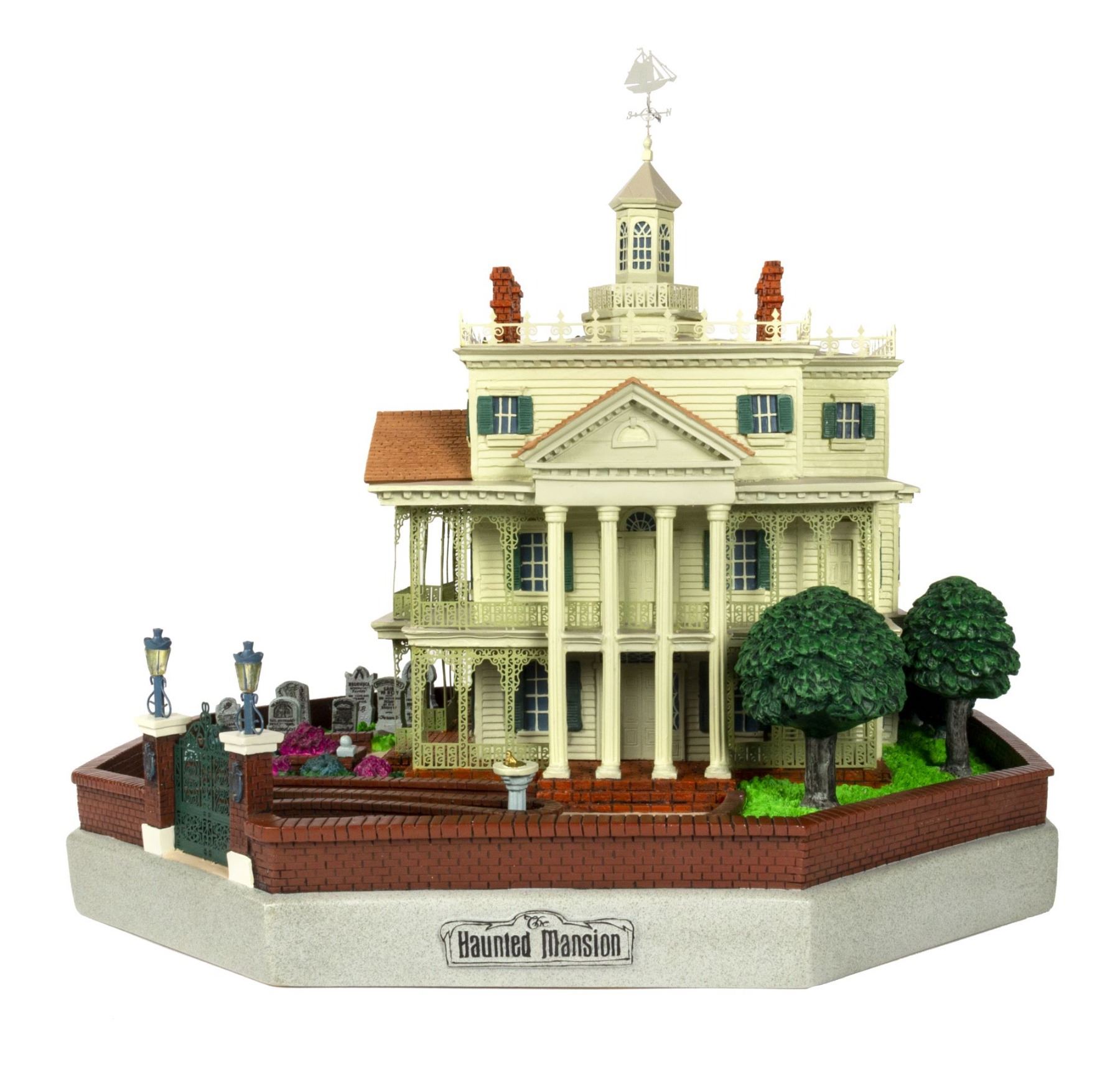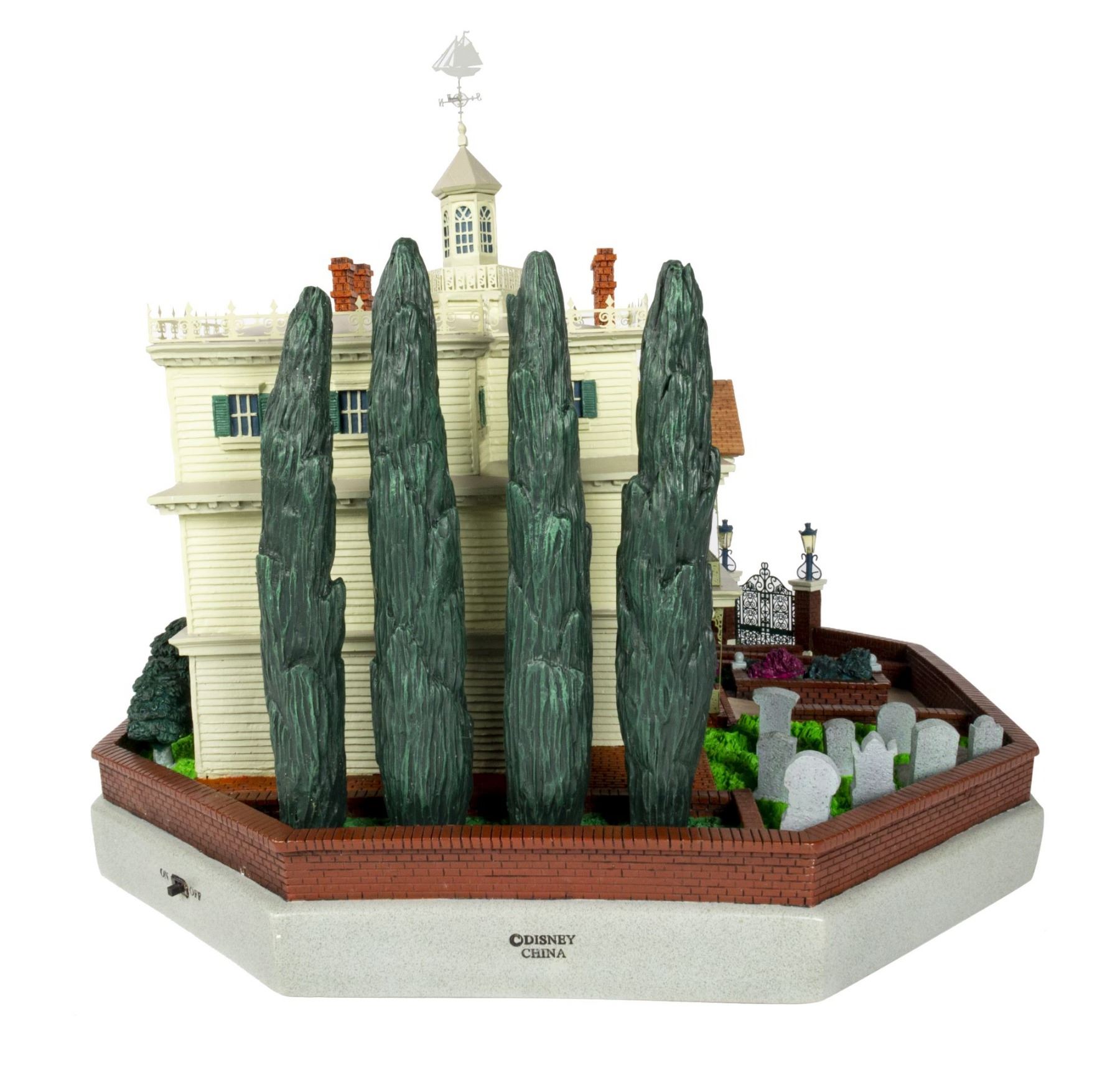 (Disneyland, 2004) A stunning Magical Big Figurine created by Larry Nikolai for the 35th anniversary of the Haunted Mansion. This "Big Fig" depicts a small-scale version of the attraction, including a small graveyard. The figure is battery-operated, with lights throughout and sounds that play when some of the tombstones are pressed. Measuring approximately 16" in diameter and 14" tall, the figure is in very fine condition.