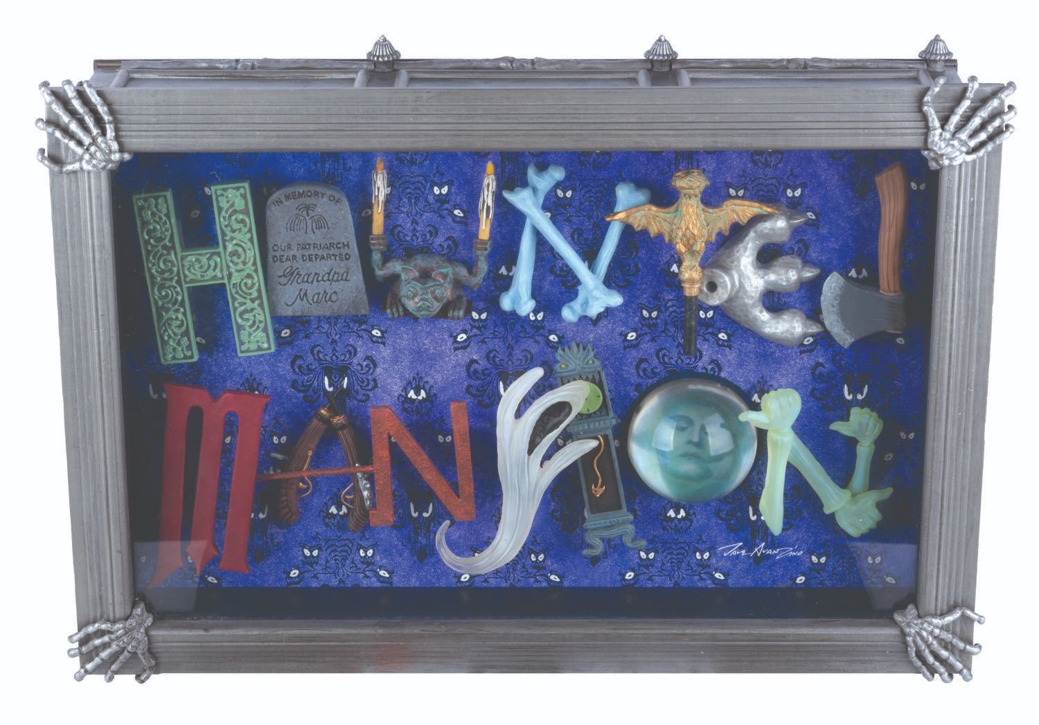 (Disneyland, 2010) A dimensional artwork shadowbox by mixed-media artist Dave Avanzino based on the "Haunted Mansion". Avanzino has used many iconic visual elements of the attraction to spell out its name, such as green wrought iron, tombstone, bat stanchion, Madame Leota's crystal ball, and the arms of the Hitchhiking Ghosts, among others. The work comes framed in a coffin-style shadowbox, and measures 11"x16" and 4" thick. The condition is fine.