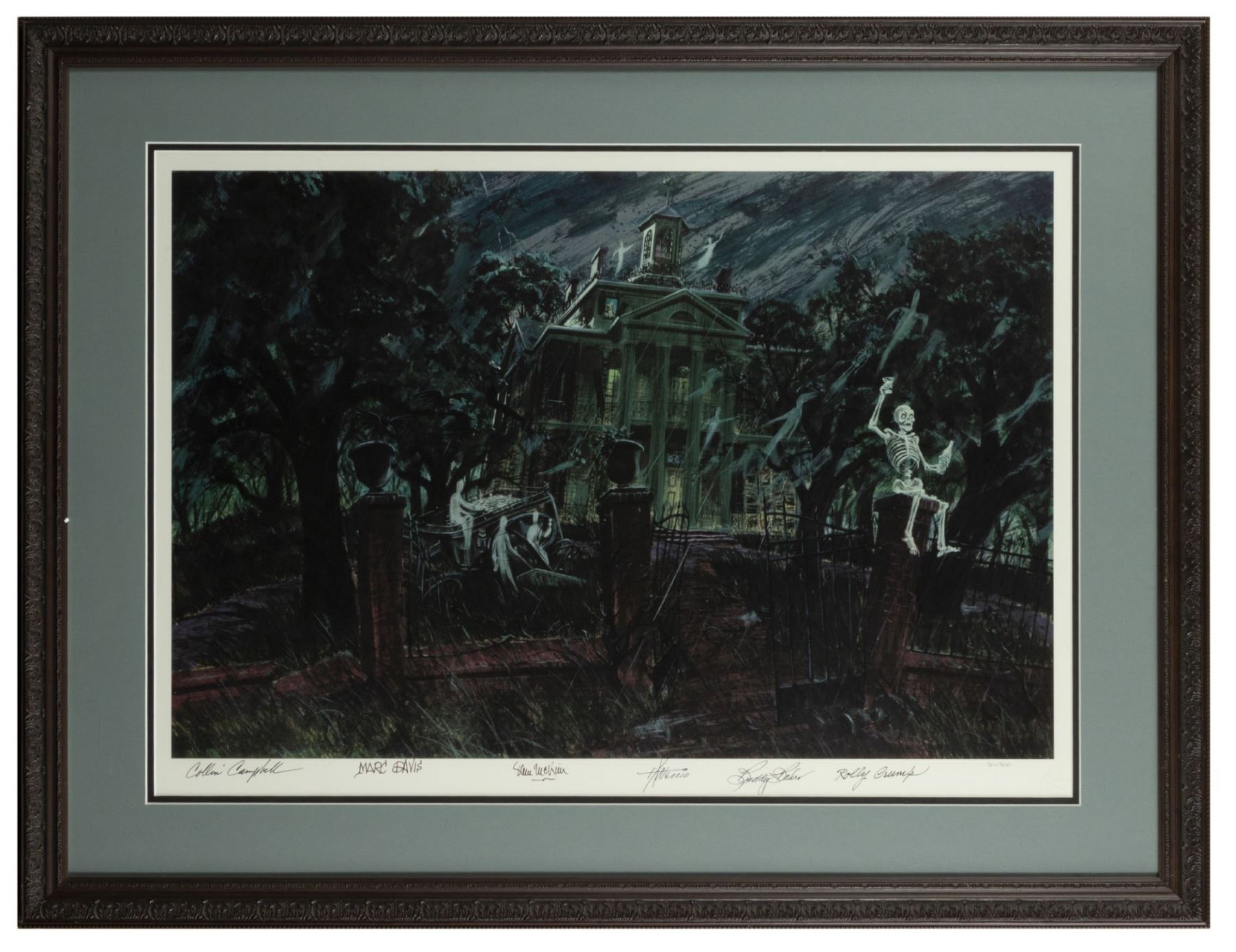 (Disneyland, c.1990s) A large limited edition print of Imagineer Colin Campbell's concept artwork for the Haunted Mansion. This print was created by the Disney Gallery and is signed by 5 Imagineers: Colin Campbell, Marc Davis, Sam McKim, X Atencio, and Rolly Crump, as well as Buddy Baker, who composed the music for the iconic song "Grim Grinning Ghosts". Measuring an impressive 28.75"x37.5" within its frame, the print is in very fine condition and is hand-numbered 86/300.