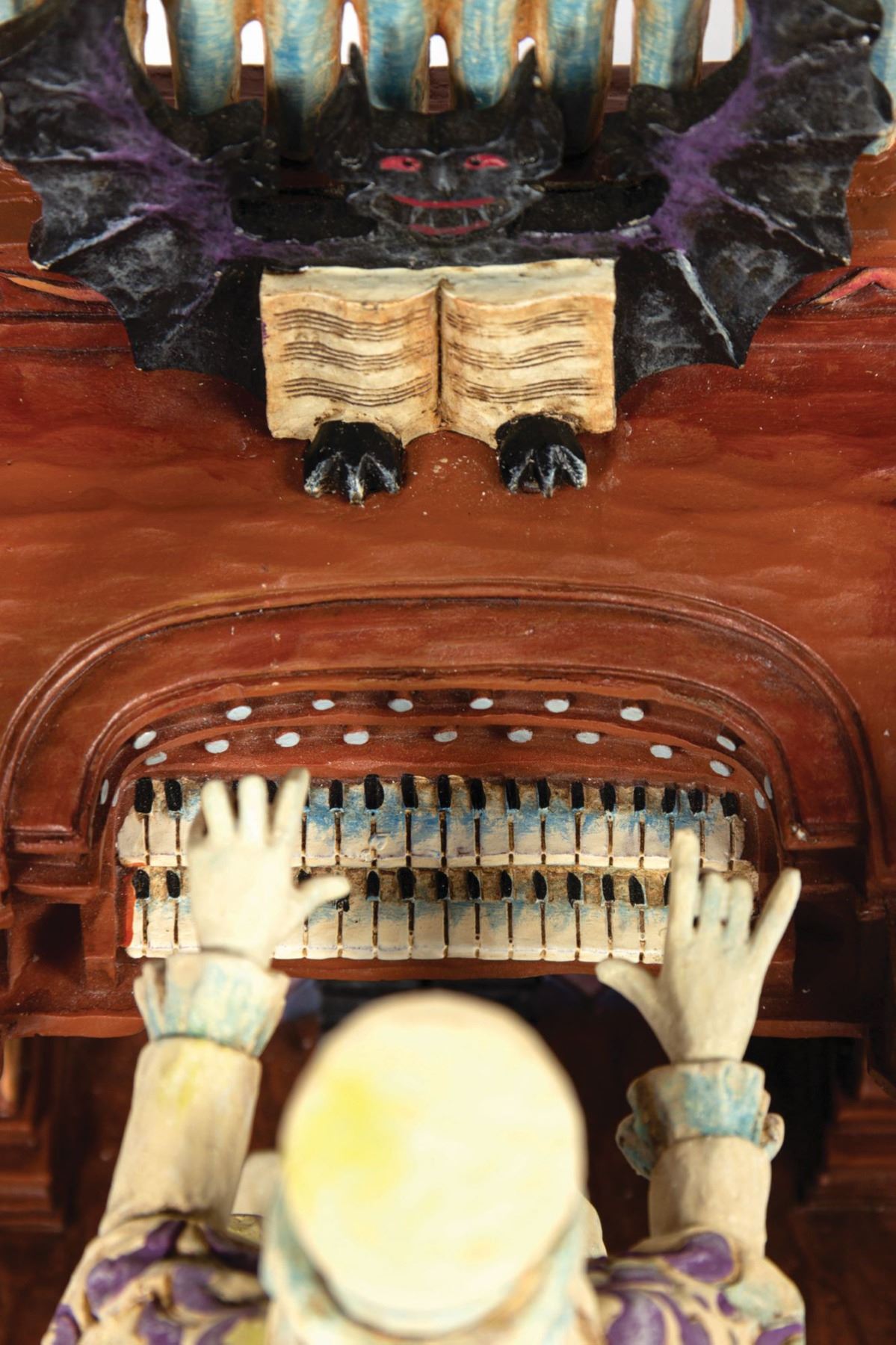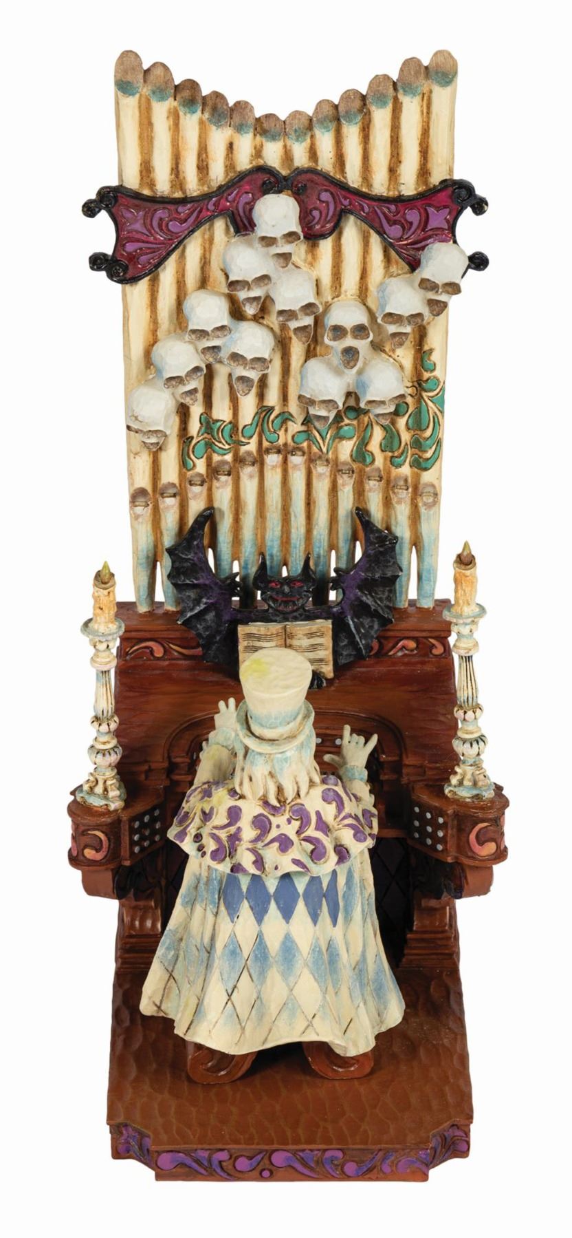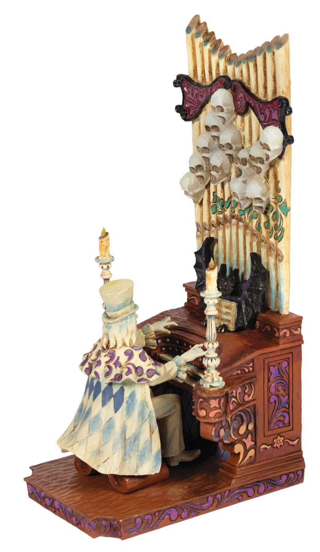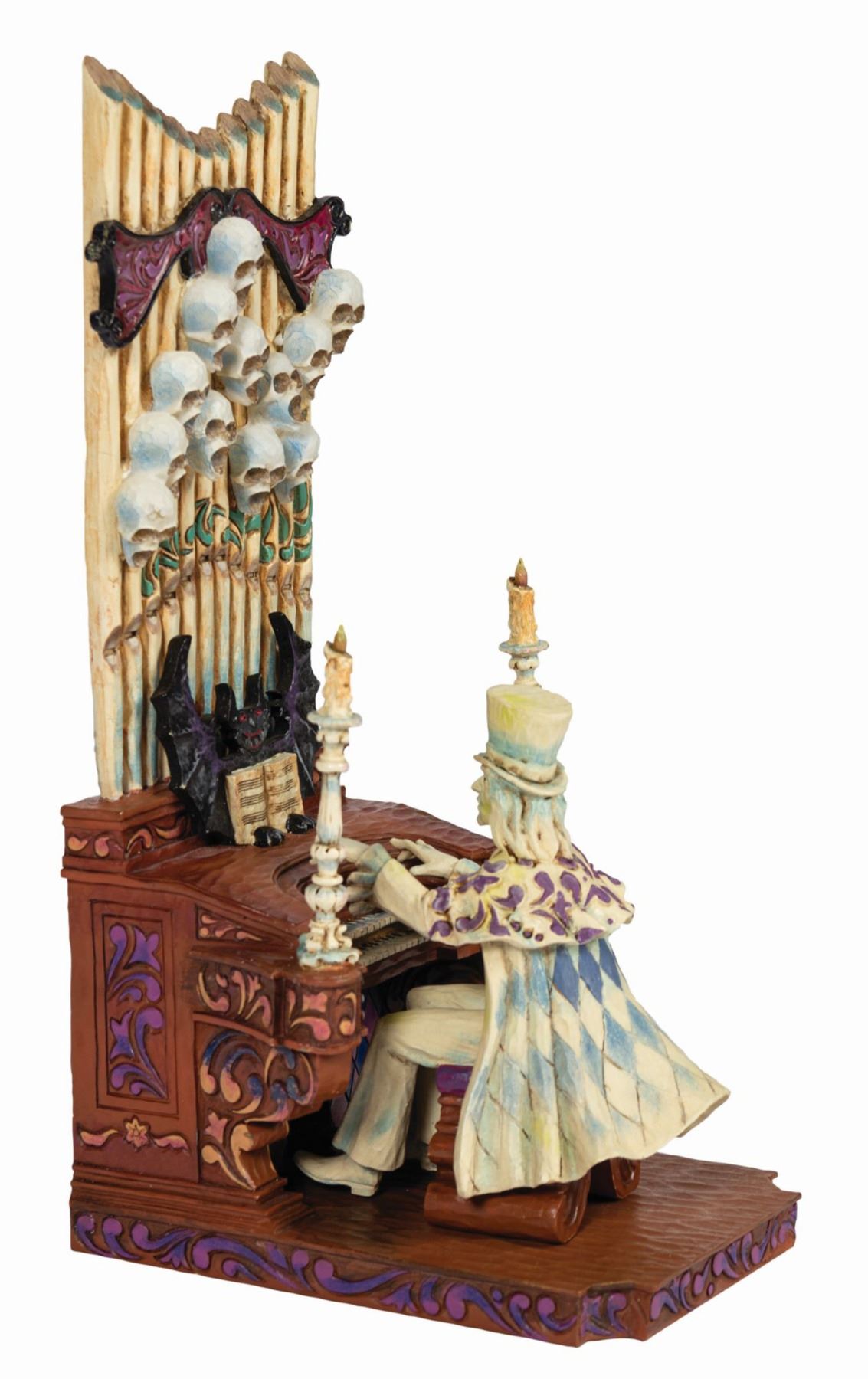 (Disneyland, 2015) A light-up figure of the Haunted Mansion's Organ Player, created by Jim Shore for the "Disney Traditions Collection." This figure is the first version of the sculpture released by Enesco and the candlesticks and skulls light up in a beautiful ghoulish display of red, blue, and orange. The two-piece resin figurine is hand-painted with exquisite details. Measuring 6.5"x4.5" and 12.5" tall, the figurine is in very fine condition and comes with its original box and packaging.