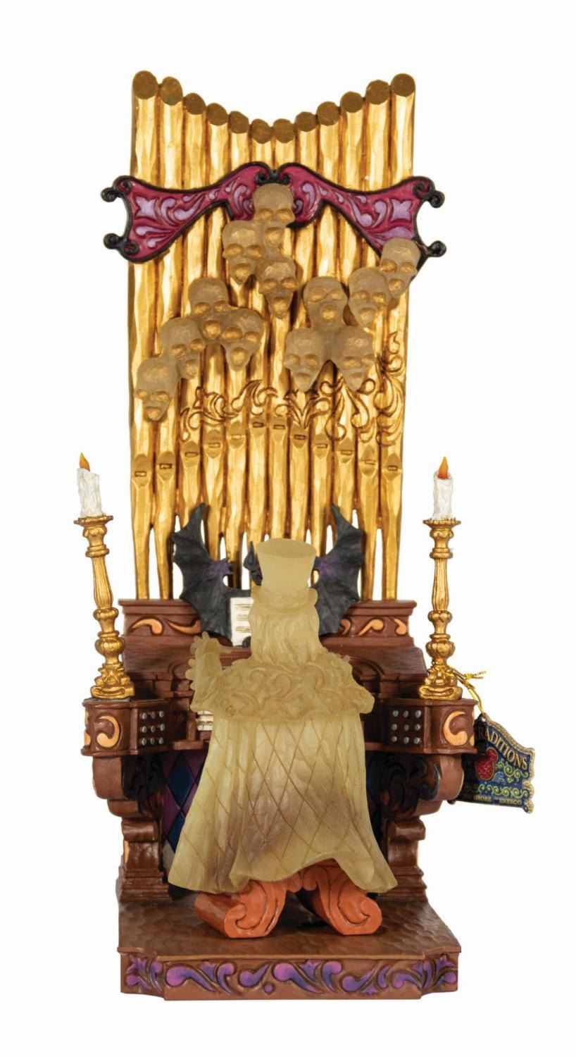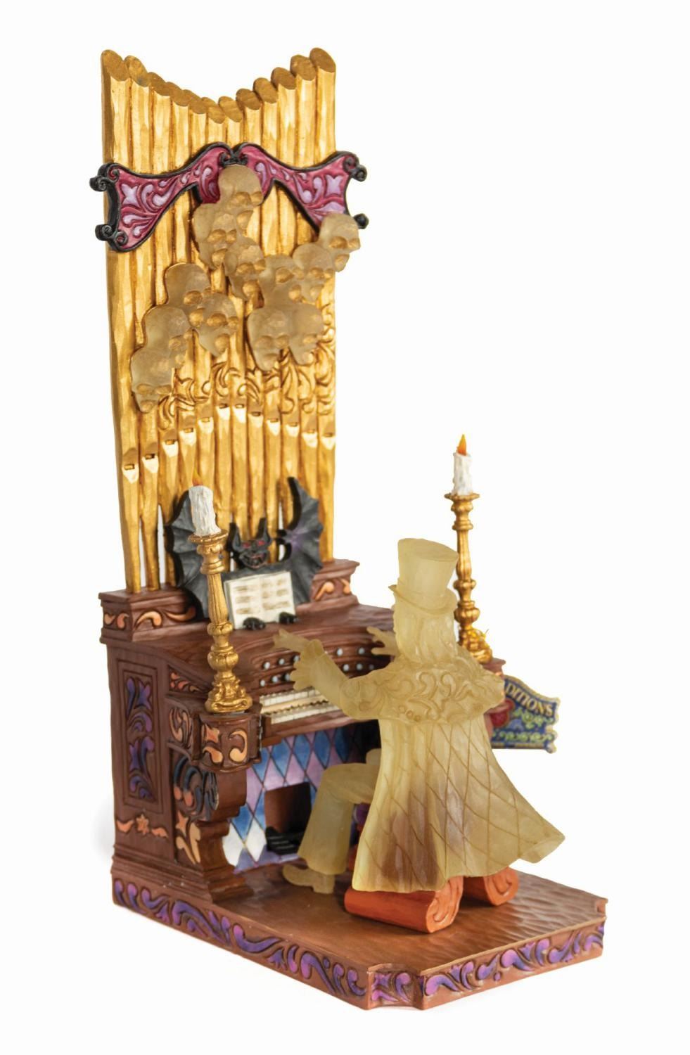(Disneyland, 2015) A figurine of the Haunted Mansion's Organ Player ghost created by Jim Shore for the Disney Traditions Collection. This glow-in-the-dark figurine is the second version of the sculpture released by Enesco. The highly detailed two piece resin figure is hand-painted and accented to appear as carved wood. Measuring a combined 12.5"x5.5" and 6.5" deep, the figurine is in very fine condition. It is accompanied by the original red Disney Showcase Collection cardboard box packaging which measures 8.5"x15" and 7" deep.