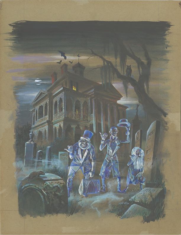 (Disneyland, 1974) An original painting by artist Dan Martinez that features a beautiful image of the “Haunted Mansion” and the iconic Hitchhiking Ghosts. This painting was used for the promotion of the “Haunted Mansion” during its earliest years in the 1970s, and can be seen on the covers of Disney News in 1974 as well as the popular Persistence of Vision magazine in 1997. The artwork is accomplished in acrylic on artist’s board, with egg whites used to create the translucent glow of the Hitchhiking Ghosts. This incredible image perfectly captures the haunting details that have made the Mansion such a popular attraction over its nearly 50 year history. The painting has an image size of 19"x15.5" within its custom 26"x22.5" frame. The condition is very good with little wear from its initial use.