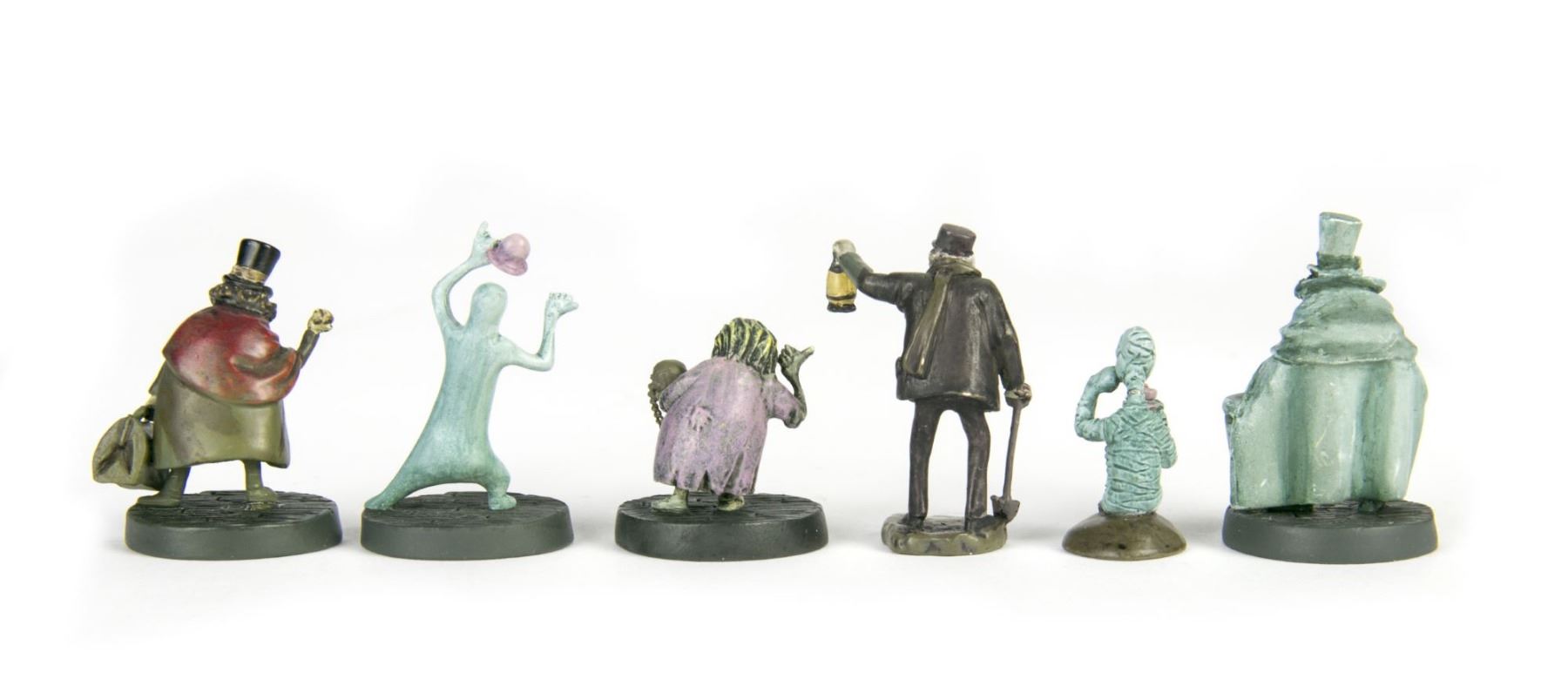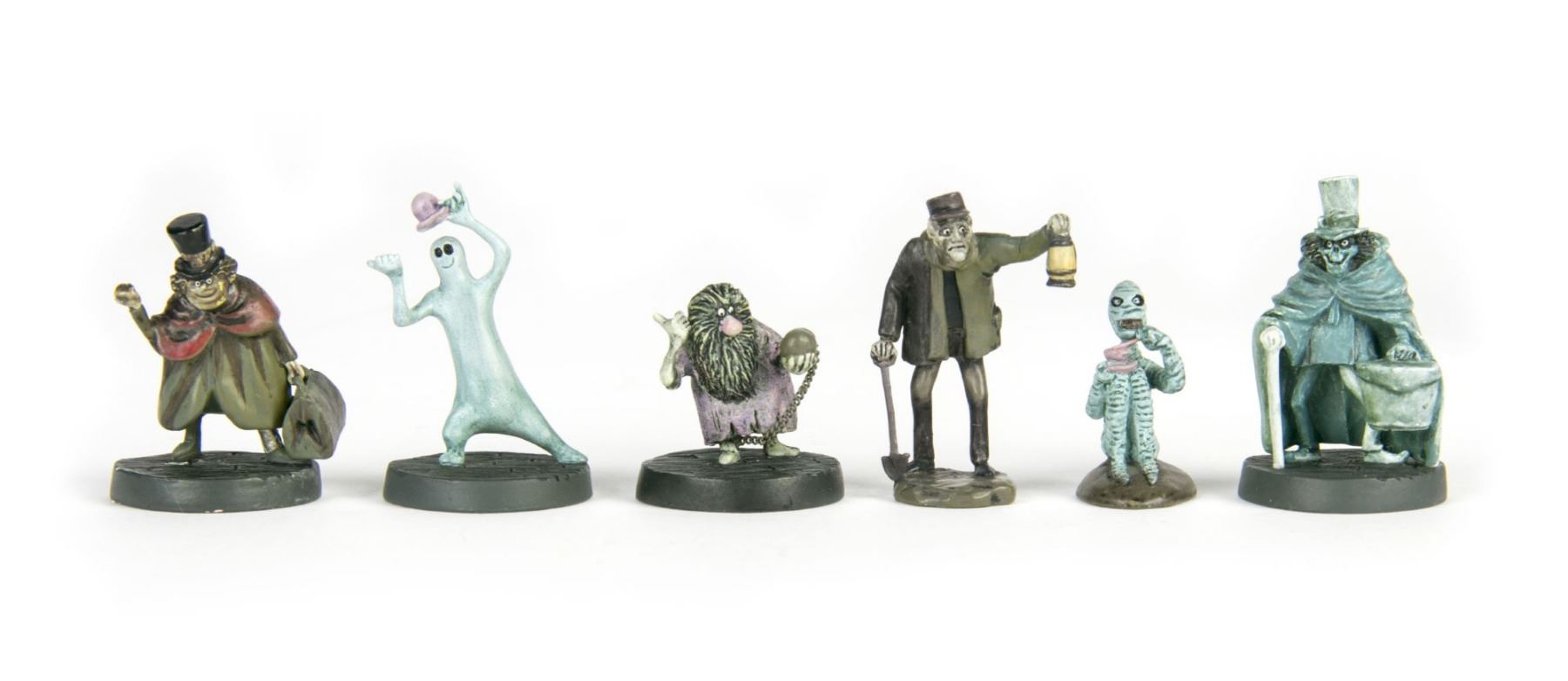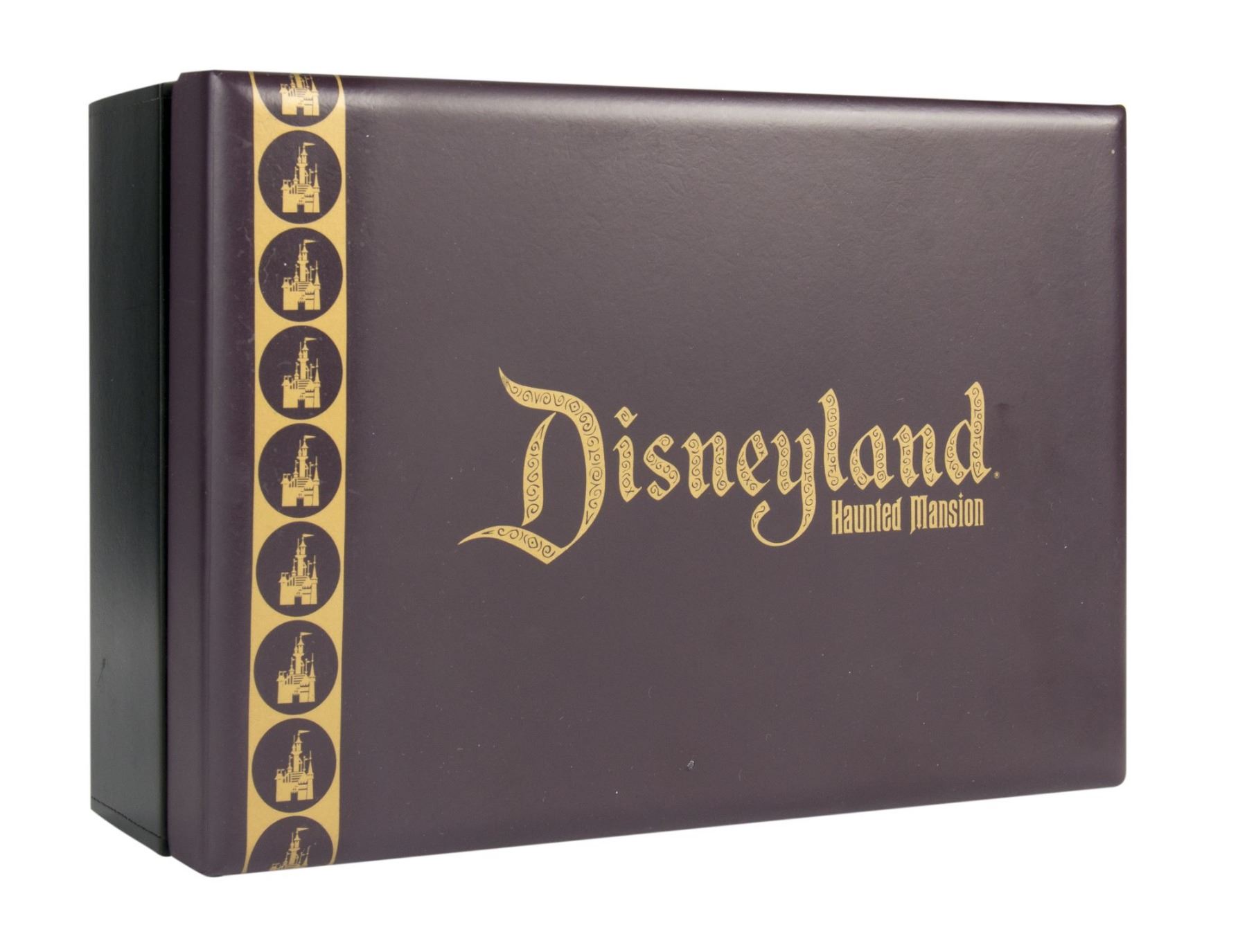 (Disneyland, 2005) This limited edition boxed set of "Haunted Mansion" themed pewter miniatures was created by Kevin Kidney and Jody Daily for Disneyland's 50th Anniversary. This set was limited to 1500 pieces and includes miniatures of: the three Hitchhiking Ghosts, the Gravekeeper, a Mummy, and the Hatbox Ghost. This boxed set measures 7"x10" and 3.5" tall, and is in very good condition with little wear to the box.