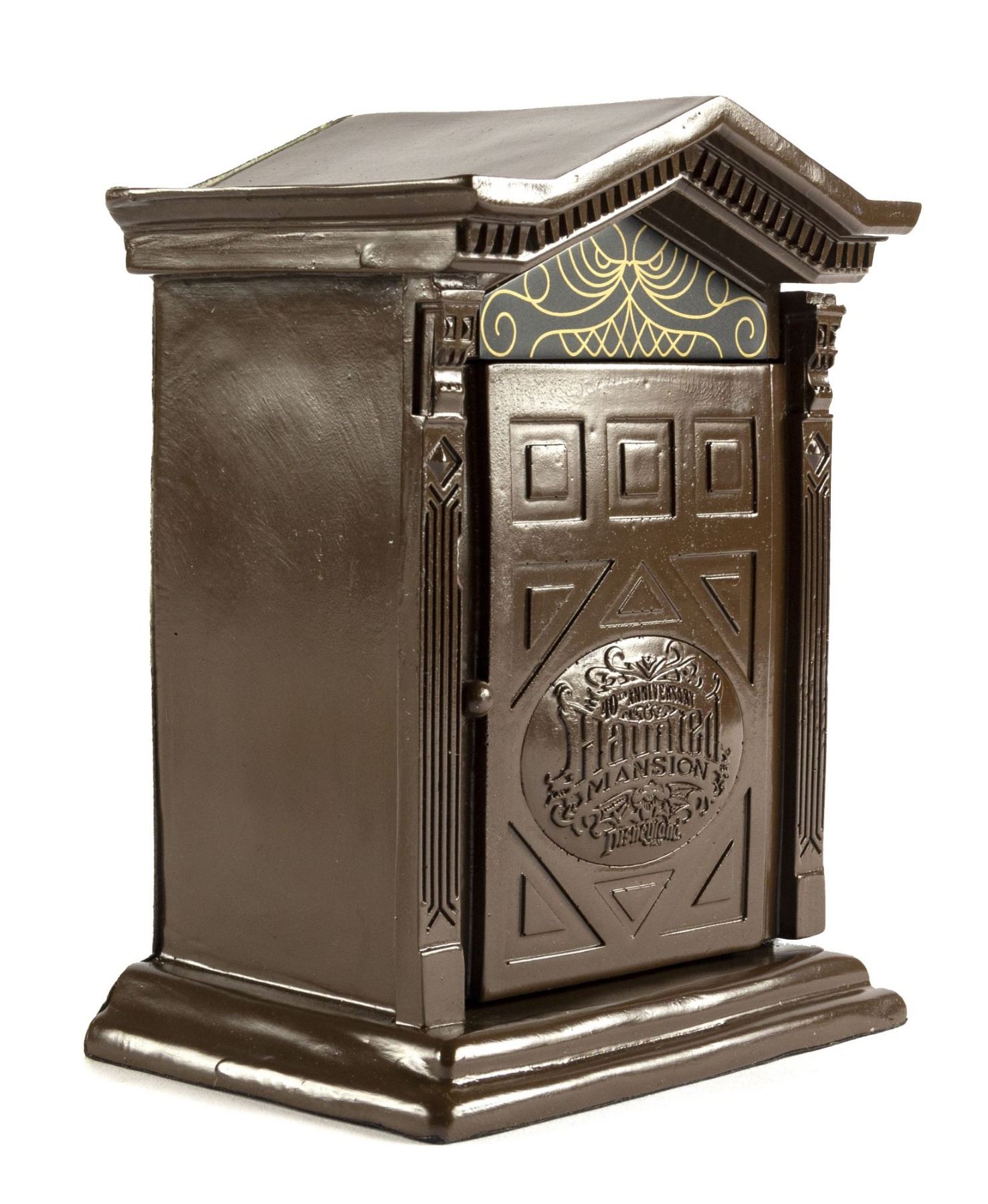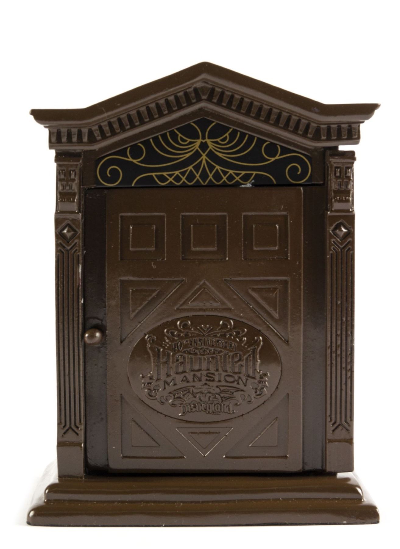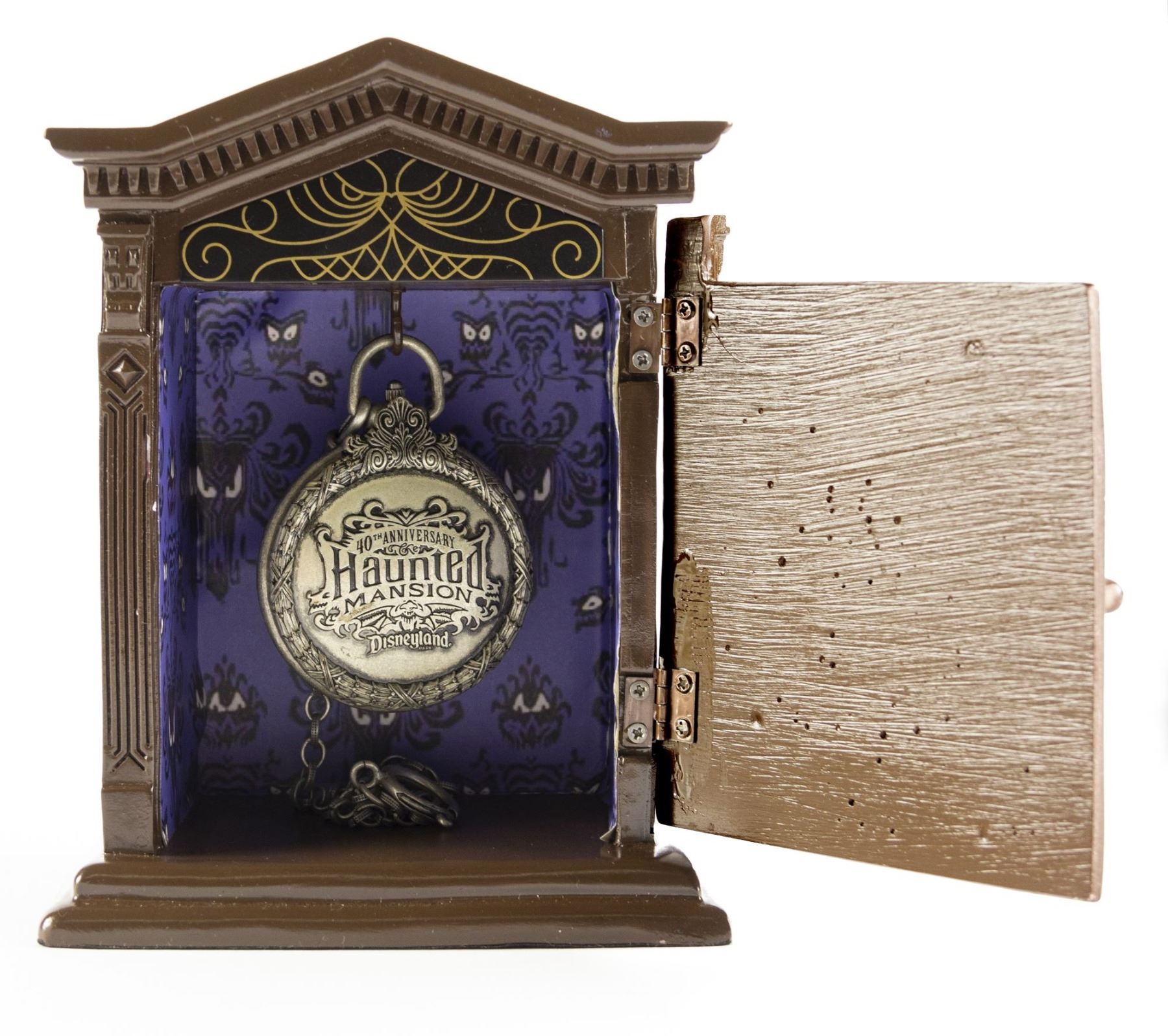 (Disneyland, 2009) A limited edition pocket watch created for the 40th Anniversary of the Haunted Mansion attraction. This metal pocket-watch comes in a decorative door-shaped case and was limited to only 300 pieces. The watch has a functioning clasp and spooky green watch-face. The watch measures approximately 2" in diameter and is in very good condition with some scuffing to the exterior. The case measures 6.75"x5" and 3.25" deep, with two small chips to the door frame and a repaired doorknob.