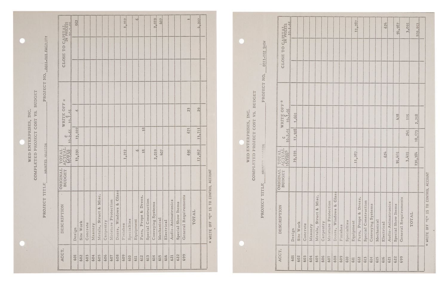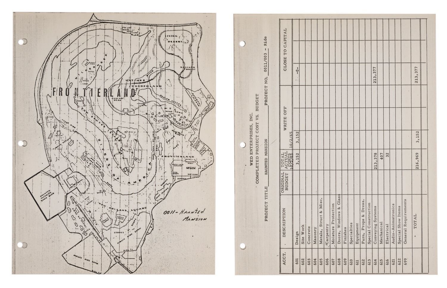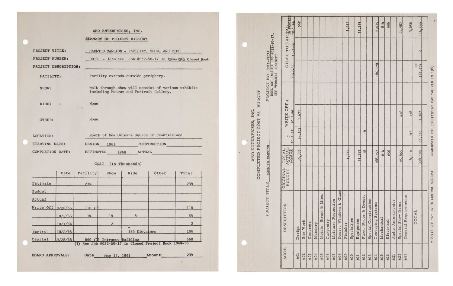 (Disneyland, 1961-66) A Summary of Project History for The Haunted Mansion prepared for Disneyland by WED Enterprises, Inc. The (10) pages contain a Frontierland Area Site Plan, an itemized list detailing the budget, actual cost, write-off, and capital related to The Haunted Mansion. Of special note are figures pertaining to the cost of the entrance building, elevators, and conveyance systems. Measuring 8.5"x11", the rare collection of documents displays in very good condition with expected wear from use.