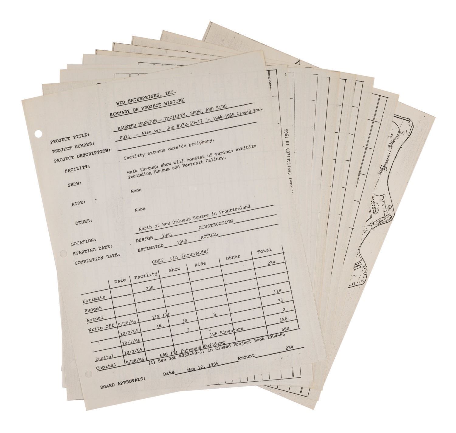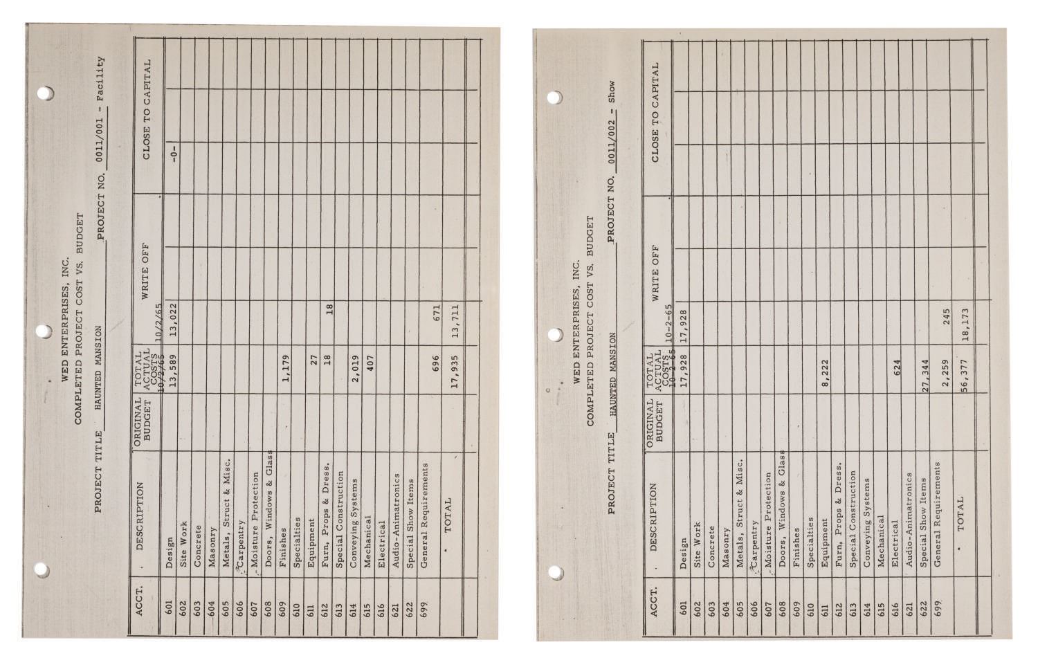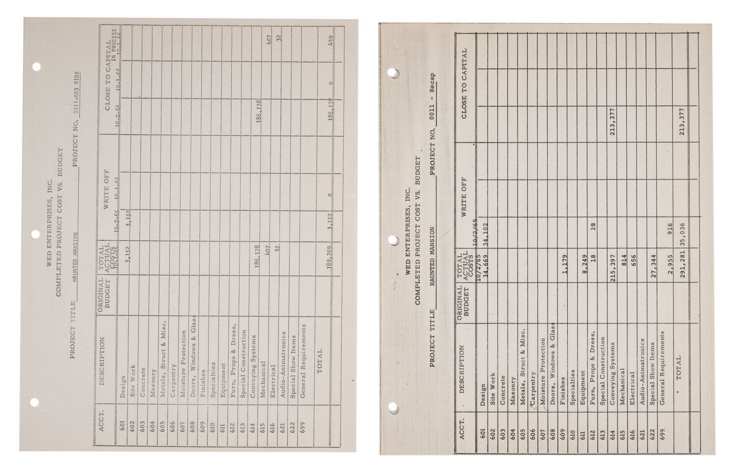 (Disneyland, 1961-66) A Summary of Project History for The Haunted Mansion prepared for Disneyland by WED Enterprises, Inc. The (10) pages contain a Frontierland Area Site Plan, an itemized list detailing the budget, actual cost, write-off, and capital related to The Haunted Mansion. Of special note are figures pertaining to the cost of the entrance building, elevators, and conveyance systems. Measuring 8.5"x11", the rare collection of documents displays in very good condition with expected wear from use.