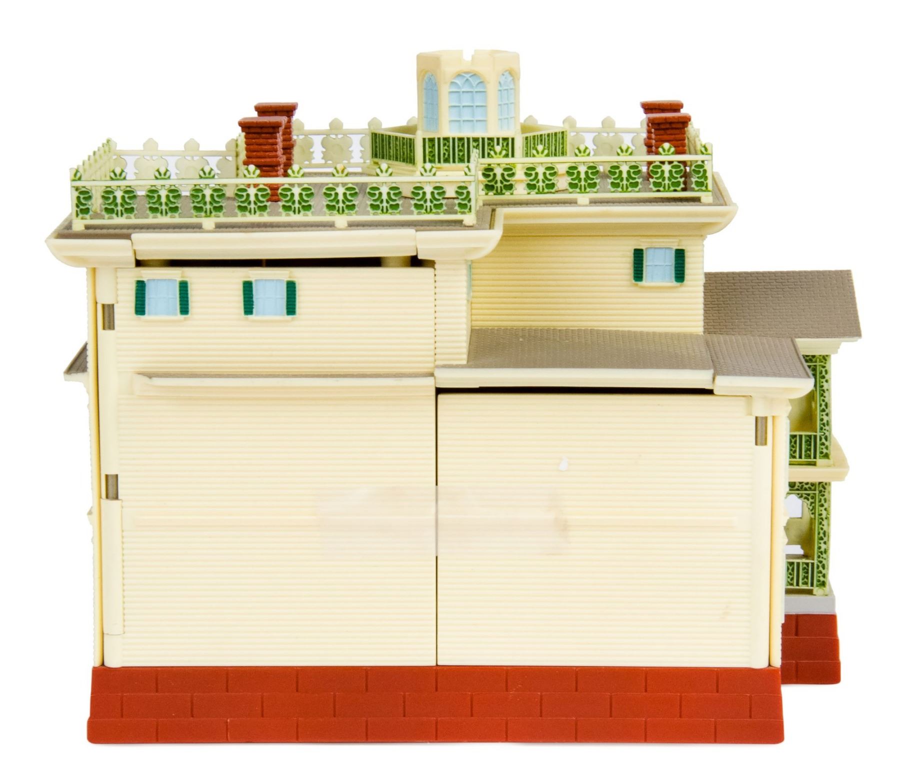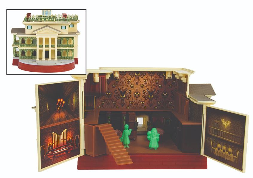 (Disneyland, c.2010s) A replica play-set of Disneyland's "Haunted Mansion" with working lights and sound. The building's structure opens in the back to reveal the inner rooms of the Mansion, as well as several play pieces including the three Hitchhiking Ghosts, a grandfather clock, Madame Leota's seance table, and more. The set has hidden panels inside, and coffin-shaped buttons on the front say phrases such as "Welcome Foolish Mortals" and "I Didn't Mean to Frighten You". The replica measures approximately 9"x9"x9", and is in very good condition with minor wear from use.
