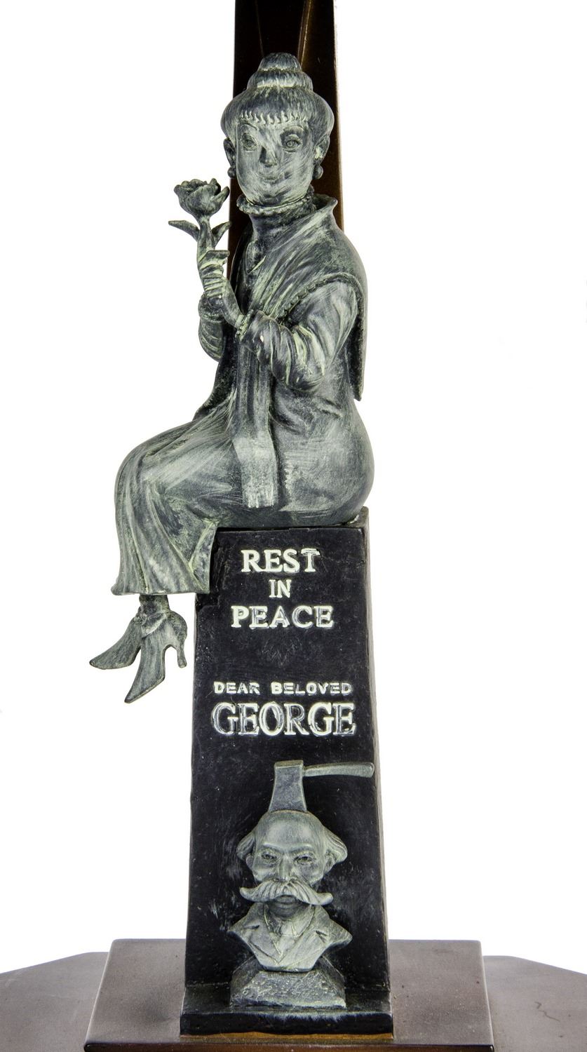 (Disneyland, 2005) A rare limited edition lamp by artist Jody Daily. This "Haunted Mansion" themed stained glass lamp features imagery of one of the iconic stretching portraits found in the attraction and is accomplished in metal, resin, and glass. This piece was created to celebrate Disneyland's 50th Anniversary and was released in an edition of 999. The lamp stands 20" tall and is in good condition with some scuffing on the side and back of the lamp.