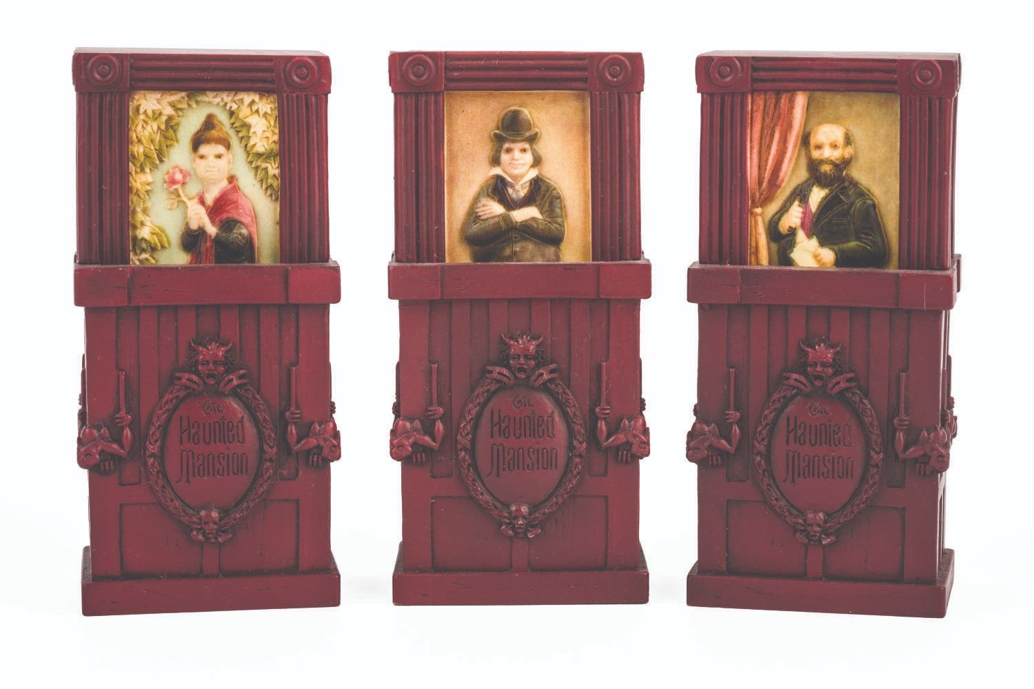 (Olszewski) A collection of three Haunted Mansion Stretching Portrait Pokitpals by Olszewski, with sliding and magnetic locking functions. Measuring 3.25"x1.5", each piece is in fine condition.