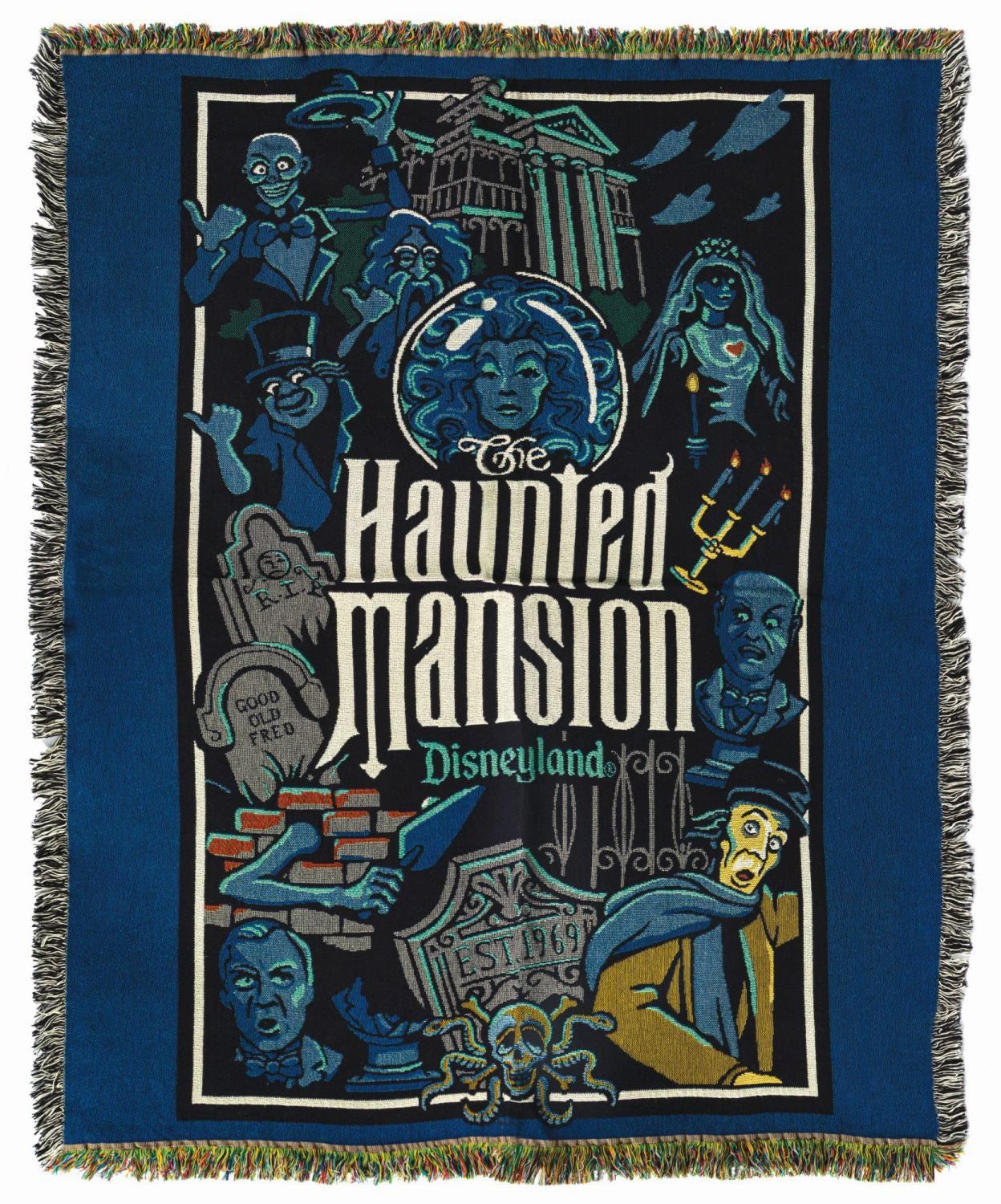 (Disneyland, c.2000s) A large Haunted Mansion luxury throw blanket. The fringed blanket features Madame Leota, the Hitchhiking Ghosts, the Ghost Bride, Singing Busts, and other iconic elements from the attraction. Measuring 65.5"x51.5", the blanket is in very fine, as-new condition.