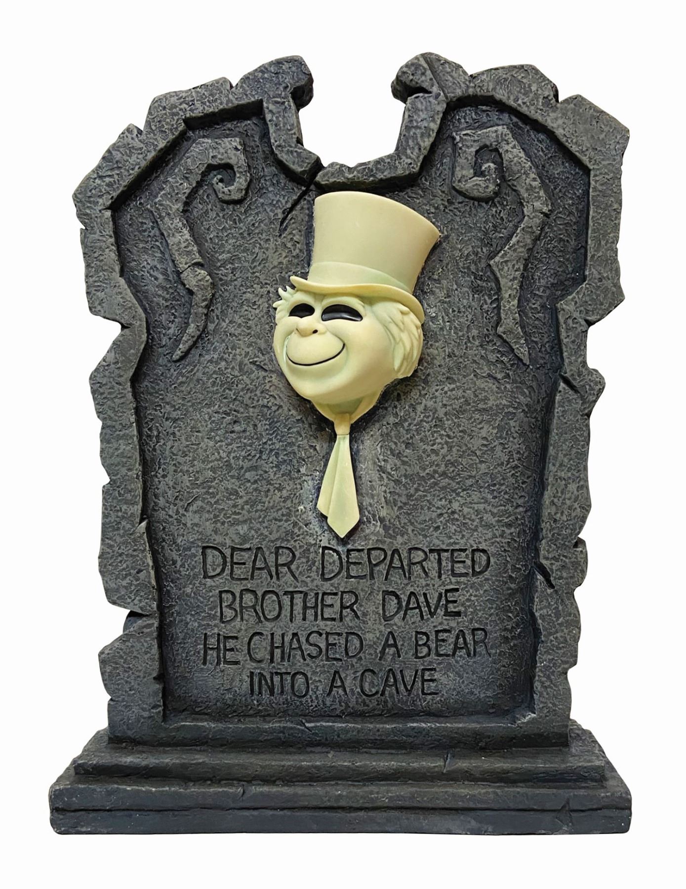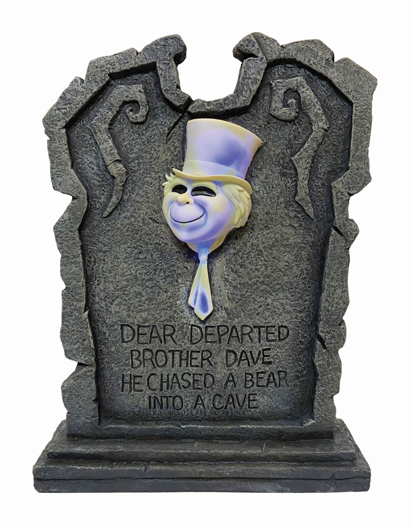 (Walt Disney World, 2000s) A large tombstone “Big Fig” for Brother Dave from the Haunted Mansion. Brother Dave's head will light up when plugged in and has written on it "Dear Departed Brother Dave He Chased a Bear into a Cave." The tombstone measures 21.25"x16.25" and is in very fine condition in its original box.