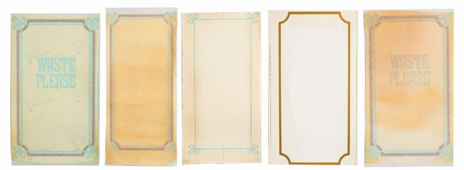 (Disneyland, c.1990s) A set of (5) screen printed graphics used in the creation of the Haunted Mansion themed trashcans at Disneyland. These (5) layers make up the aspects of the "Waste Please" stylized Haunted Mansion trashcans. While created by Disney, these graphics were never ultimately installed and remain on their original backing papers. Each measures approximately 30" long, with some variance between the layers based on how the sheets were trimmed. The condition is good, with some discoloration to the backing papers from storage which doesn't appear to have affected the screen printed graphics.