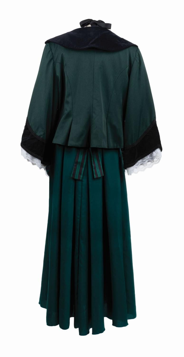 (Walt Disney World, c.2000s) A very rare female cast member costume for the Haunted Mansion attraction at Walt Disney World. This costume includes the coat, shirt, apron, and bat bow, with a matching skirt which appears to be a replica. The shirt, apron, and bat bow all retain their Disney wardrobe tags, and the shirt also bears a nametag reading "Emilee." The tag on the coat has been removed, but the outline is still visible. The shirt is a size 22, and while the coat is unmarked it appears to be a similar size, and the skirt is a size 10. This outfit is in very good condition overall, with minor wear from use.