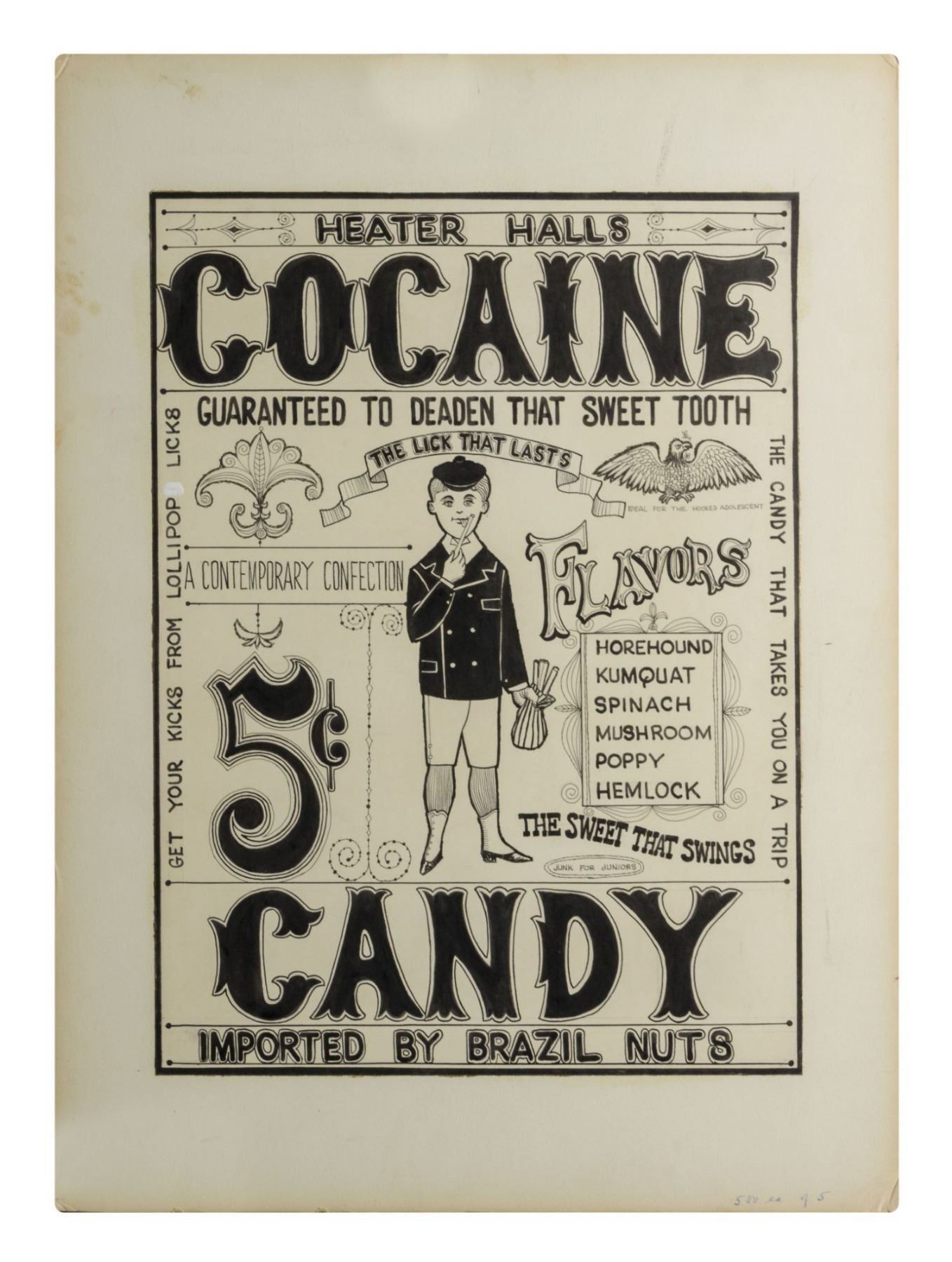 (c.1957) The original illustration used to create Rolly Crump's popular cocaine "Doper Poster". The artwork is accomplished in ink on artist's board and has an image size of 19.5"x14.5" within its 22"x17" frame. The condition is very good with minor wear.
