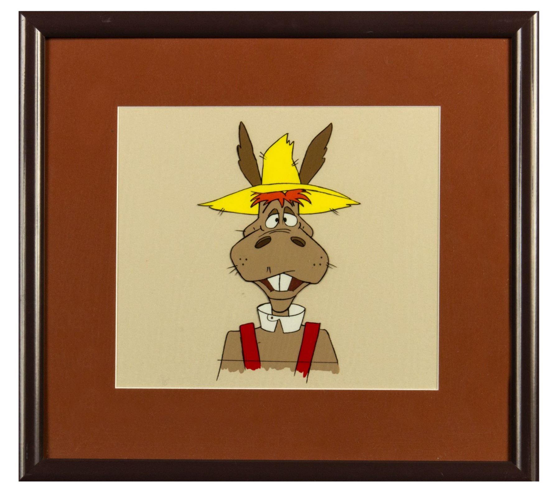 (CBS, c.1969) An original animation cel from the “Hee Haw“ variety show that ran on CBS from 1969 to 1971, and then in syndication from 1971 to 1993. Based on TV’s popular “Laugh-In”, the show used Country Music and rural comedy to reach a wide-ranging audience. The frame displays an image size of 9"x10". The cel has not been examined out of the 15.5"x16.5" frame, but the condition appears to be very good with minor wear including some scuffs in the plexiglass.