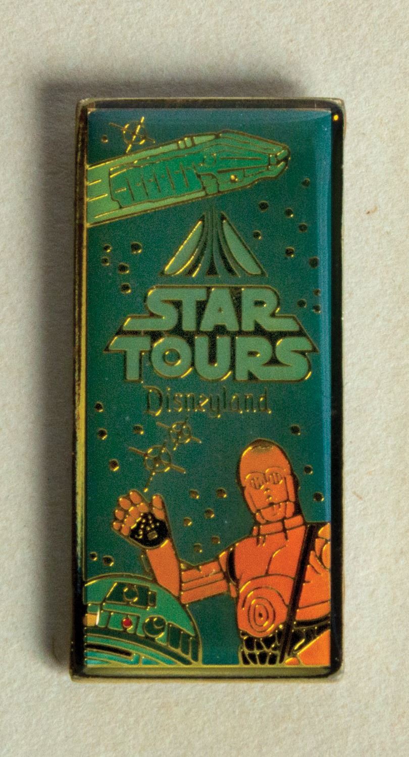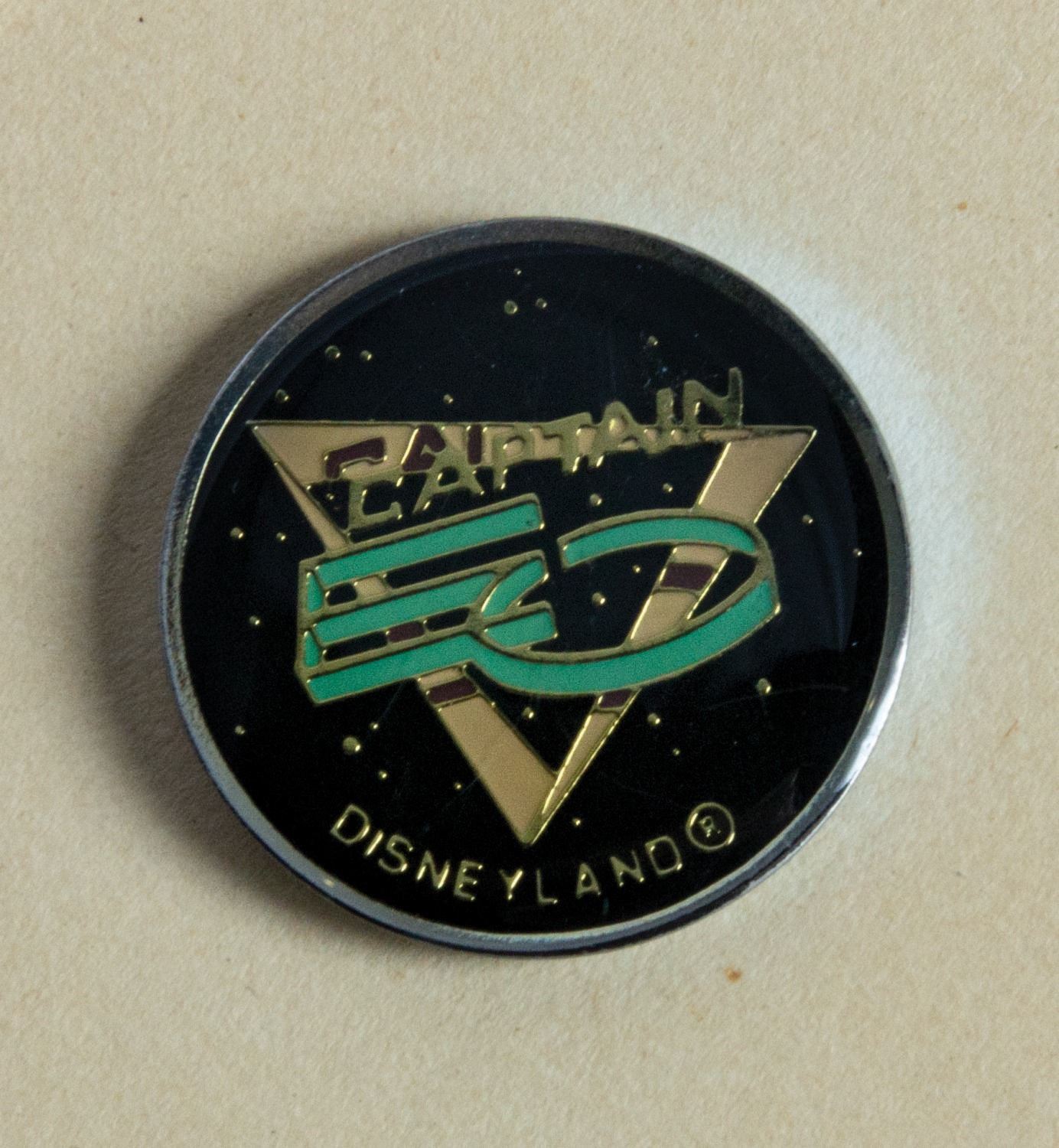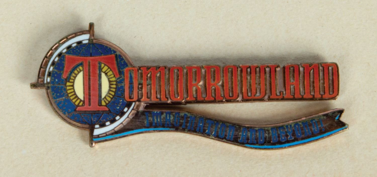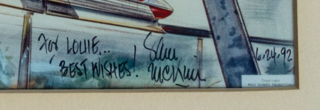 (Disneyland, 1991-2014) A print of John Hench’s iconic "Crossing Monorails" concept artwork framed with a collection of (19) pins for Tomorrowland attractions. The color print is signed and dated in black ink at lower left, “To Louie John Hench 11/7/91” and at lower right, “For Louie…Best Wishes Sam McKim 6-24-92.” A collection of (19) Tomorrowland-themed Disneyland pins are affixed to the mat around the print. The print measures 8.25”x13.25” visible through a 17”x20.75” wooden frame with gold-tone accents and is in very good condition. The pins are also in good condition with minimal wear.