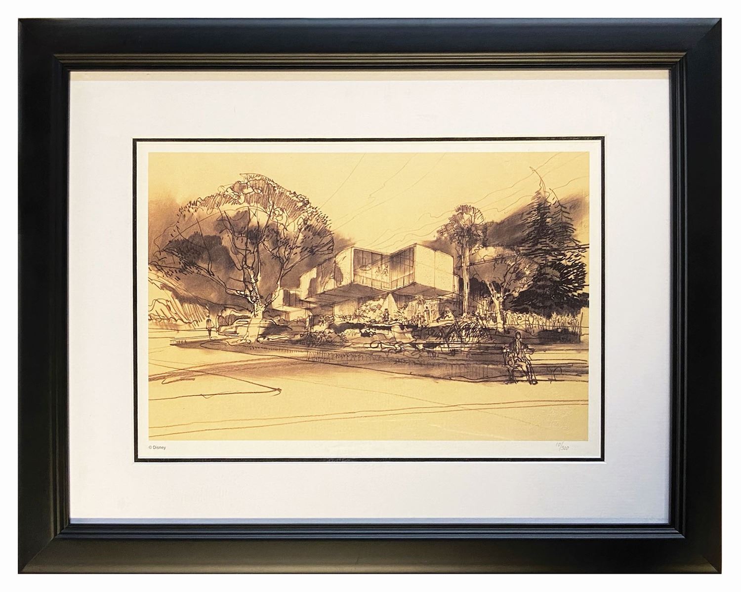 (Disneyland, 1997) A limited edition print of concept art for the House of the Future by Imagineer Herb Ryman. This print was available at the Disney Gallery and is hand-numbered 10/300. Measuring 9.25"x13.5" in the 16.25"x20.75" frame, the lithographic print is in very good condition with minimal wear.