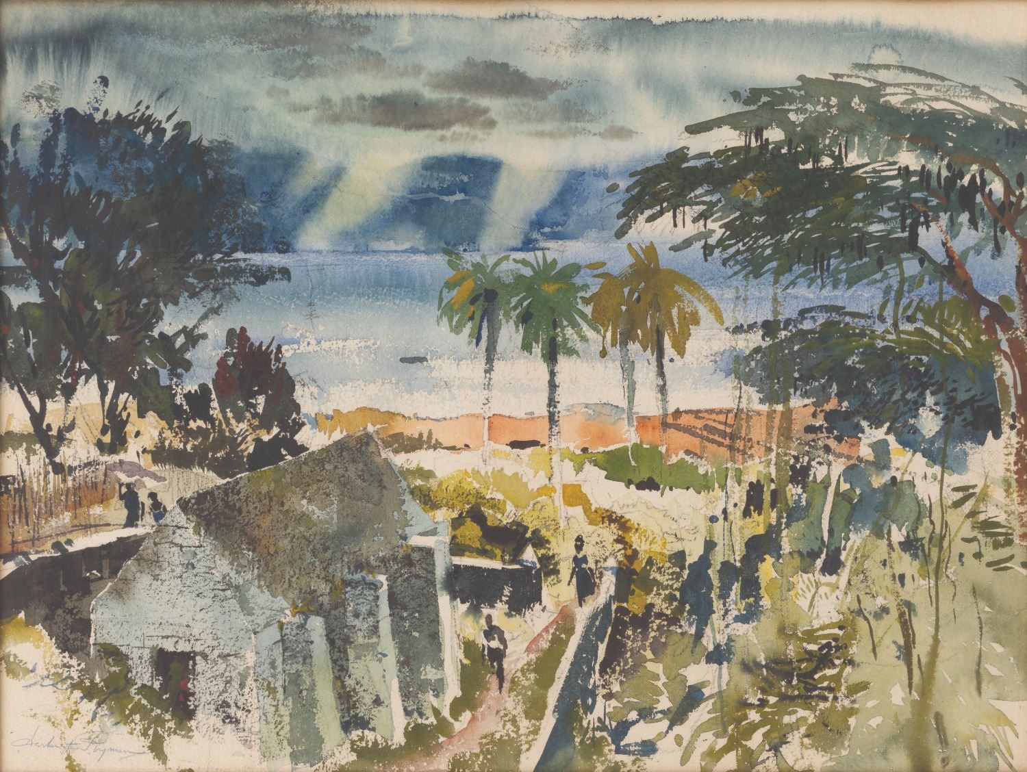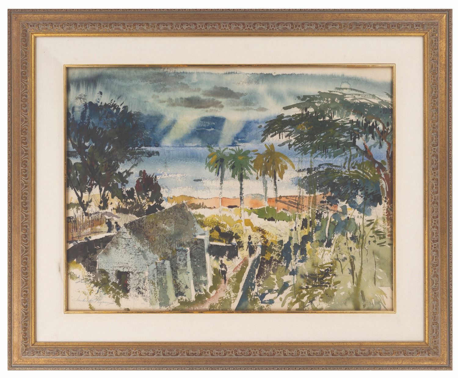 (Ryman, Date Unknown) A watercolor painting of a beach by Disney Legend Herb Ryman. Ryman was a world traveler and would often paint scenes of the places he visited. This painting could be from his travels to Jamaica in the 1930s. The painting comes from the Ryman Estate and was displayed at the Disneyland Gallery in late 2000. The artwork measures 27" x21"and is still in its original 38"x31" frame. The painting is in very good condition with slight wear from age. The original frame is worn and chipped.