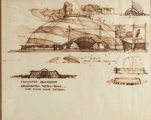 (Disneyland, c.1967) An original concept drawing by Imagineer Herb Ryman for areas of Tomorrowland labeled "Dome for Time Machine". This drawing is accomplished in brown ink on three-hole animation paper and comes framed and matted. This item has an image size of 11.75"x15" within its 21"x24.5" frame. This item is in very good condition.