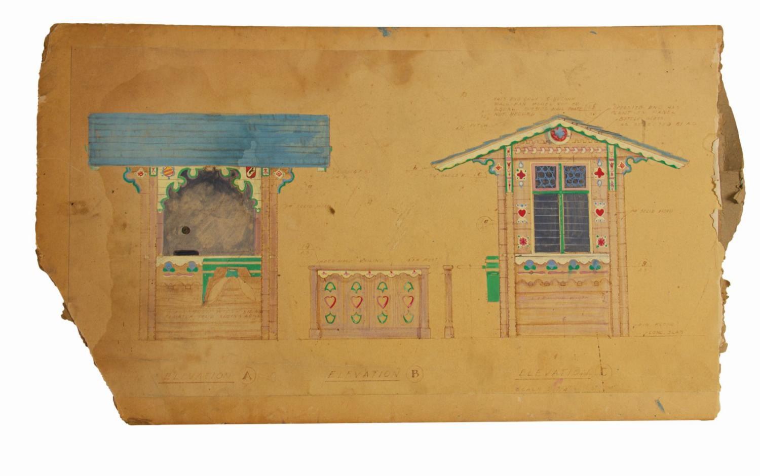 (Disneyland, c.1956) An original concept painting for the Skyway ticket booth in Disneyland's Fantasyland by Disney Legend Herb Ryman. Accomplished in gouache over an Imagineering blue line print of the ticket booth plans mounted to illustration board, the concept painting adds architectural and design elements such as gingerbread trim and whimsical wooden cutouts and floral accents. Measuring 20.5"x12", the artwork is in good condition with some staining, brown toning, and tattering at the edges.