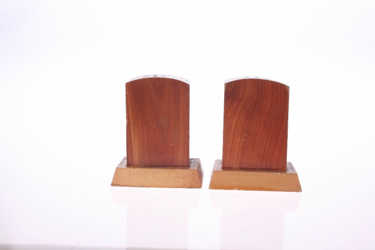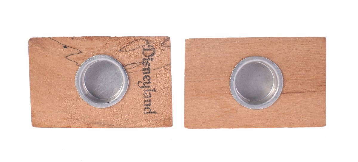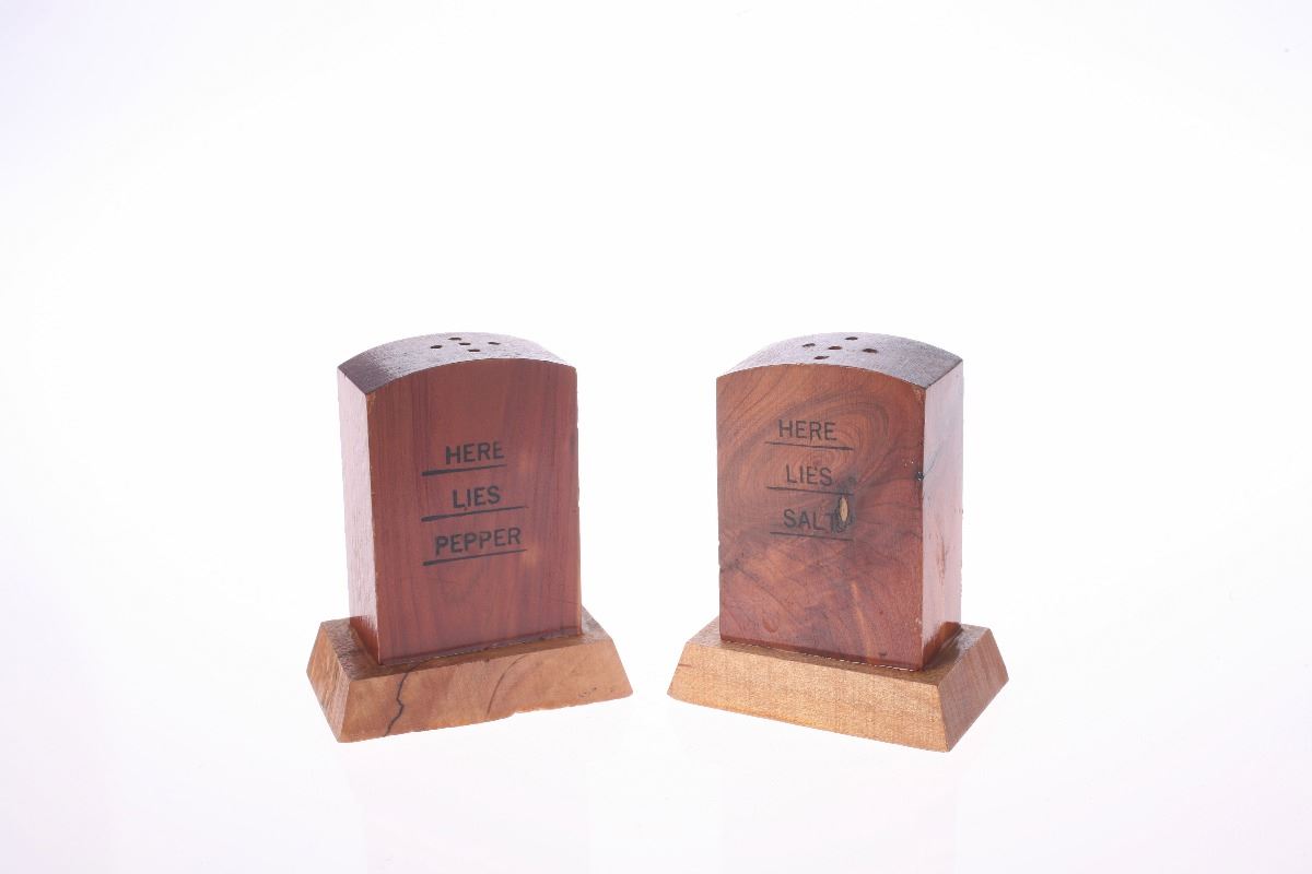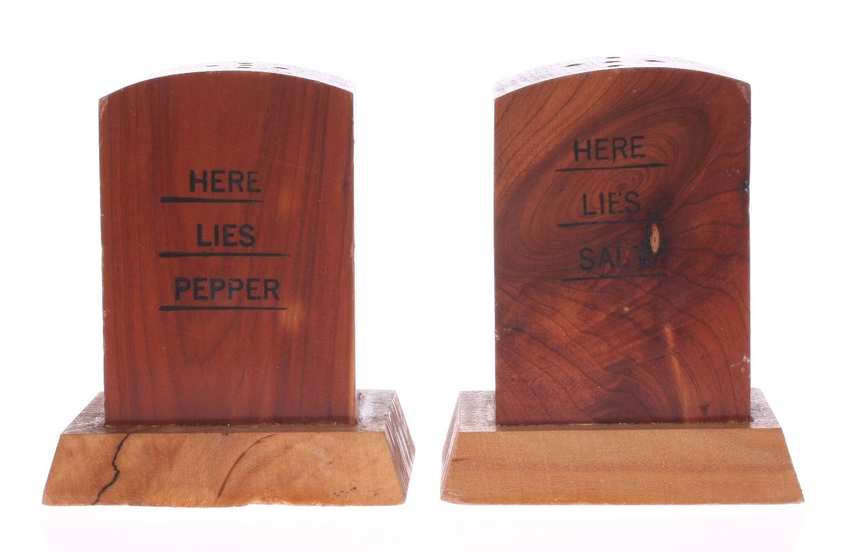 (Disneyland, 1950s) Wooden tombstone salt and pepper shaker set with "Here Lies Salt" and "Here Lies Pepper" written on the fronts. Measure 1.25"x2" and 2.4" tall, each. Pair is in good condition.