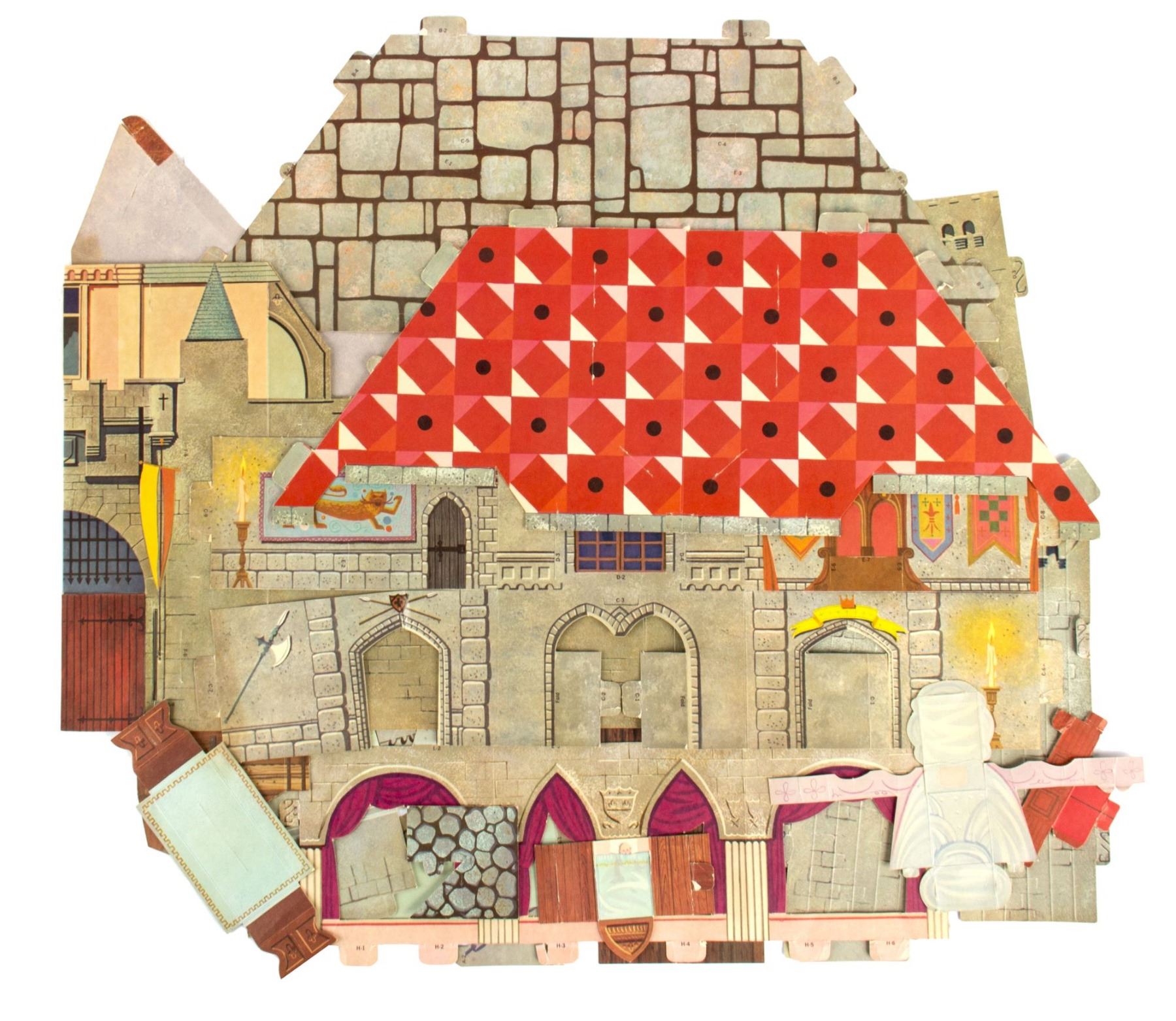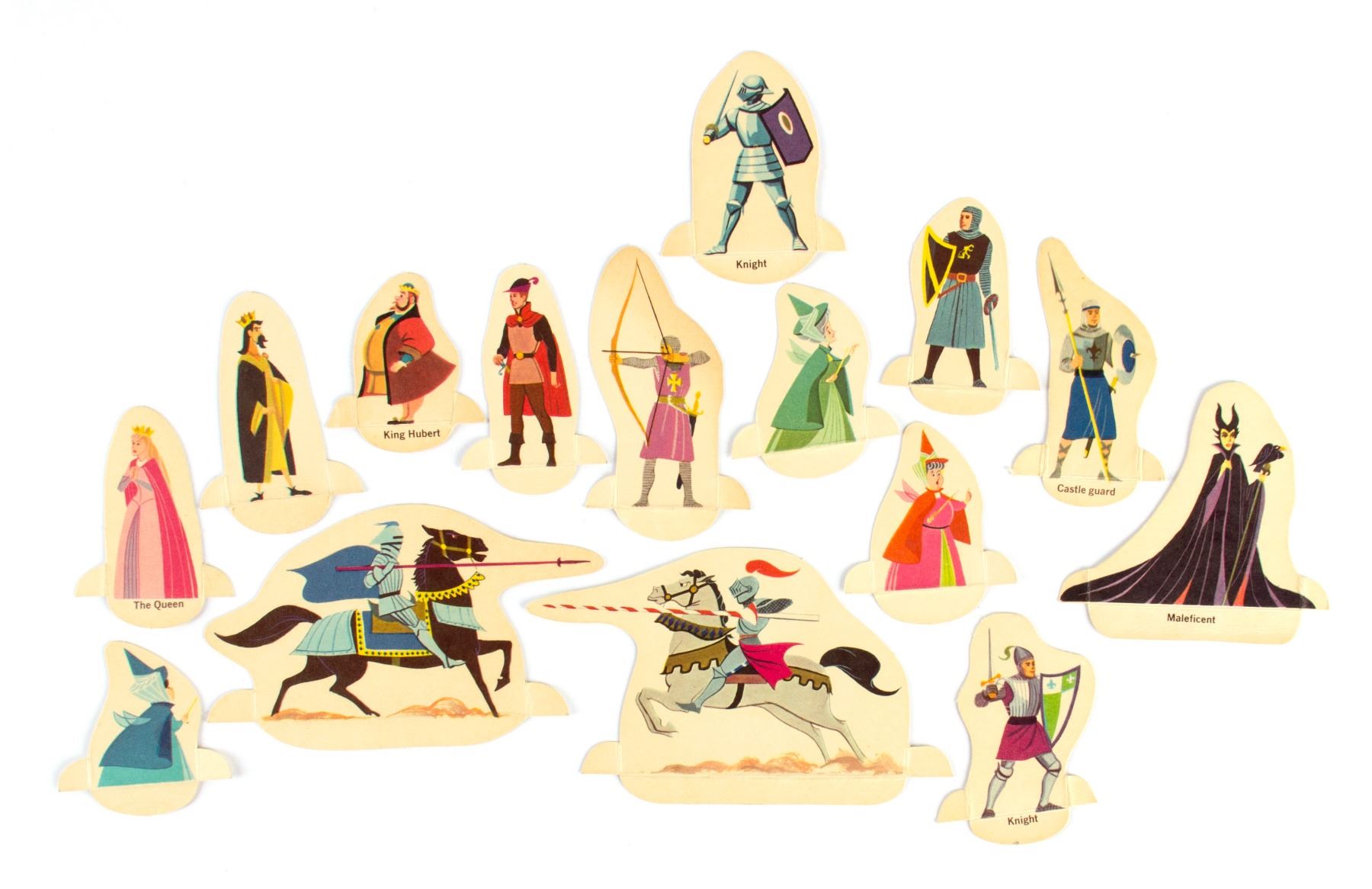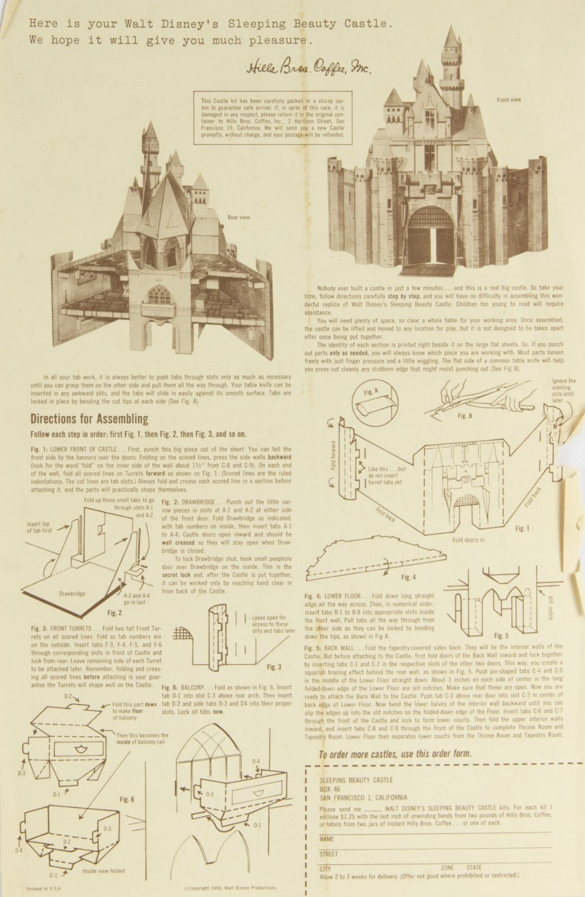 (Disneyland, 1959) As a promotion for the theatrical release of "Sleeping Beauty", Hills Bros. Coffee offered a mail away "Sleeping Beauty Castle" model complete with a drawbridge, catapult, and characters from the film. This intricate model measures 13.5"x23.5" when built and comes unassembled in its original mailing box, with instructional sheet and illustrated movie synopsis booklet. The condition is very good with some wear throughout from light use. The set is missing a few smaller pieces such as the Sleeping Beauty paper character, but includes the other 15 characters.