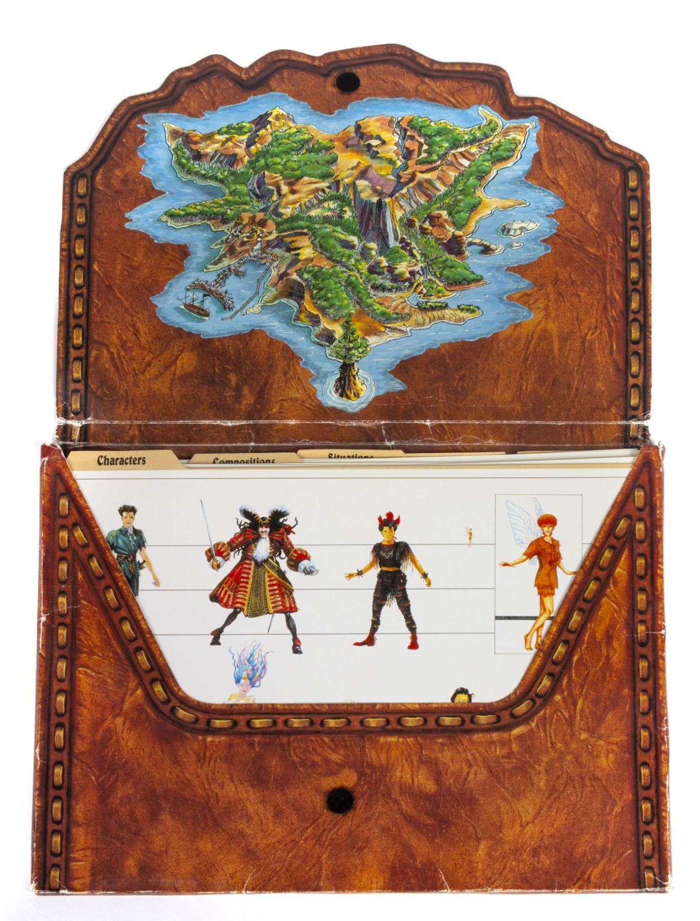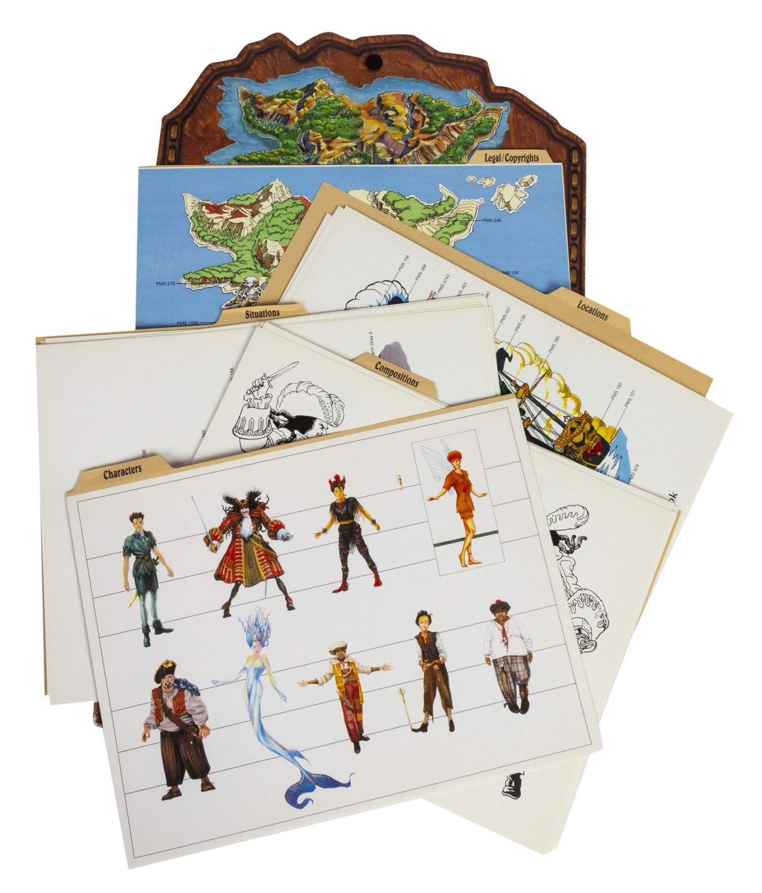 (Amblin, c.1990) A rare style guide created during production of the feature film Hook. The style guide contains over 50 sheets of printed artwork and information in several categories such as "characters", "compositions", and more. This impressive production resource includes many elements and character designs which did not make it into the final film, as well as many familiar aspects which did. The sheets measure 9"x12" while the outer folder measures 9.75"x12.5". The condition is good with some creasing and wear throughout from use, particularly to the outer folder.