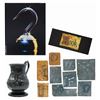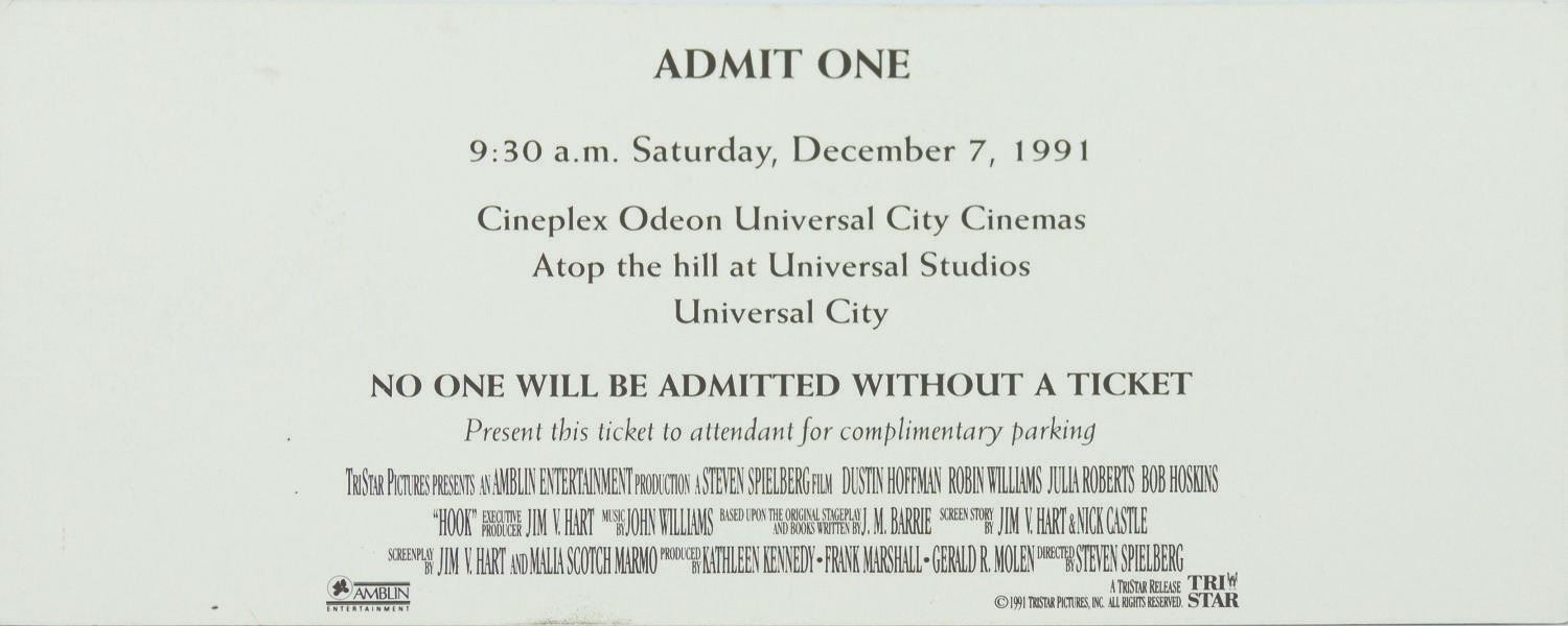 (TriStar, 1991) A collection of production, premiere, and promotional items from director Steven Spielberg's continuation of the Peter Pan story, Hook. The set includes an ornate metal handled tankard engraved with the film's text logo, a set of (9) punched and etched metal stencils used to detail props during production, a ticket for the film's premiere at Universal on December 7, 1991, and a bi-fold cardstock premiere program listing cast and crew. Ranging in size from 2.25"x2" to 11"x8.5, the pieces are in generally good to very good condition. The tankard is dented with white spot staining and surface loss, the stencils have oxidation and dents, and the paper items bear some edge wear.