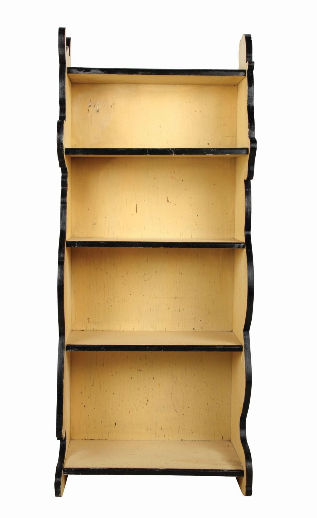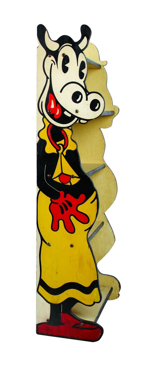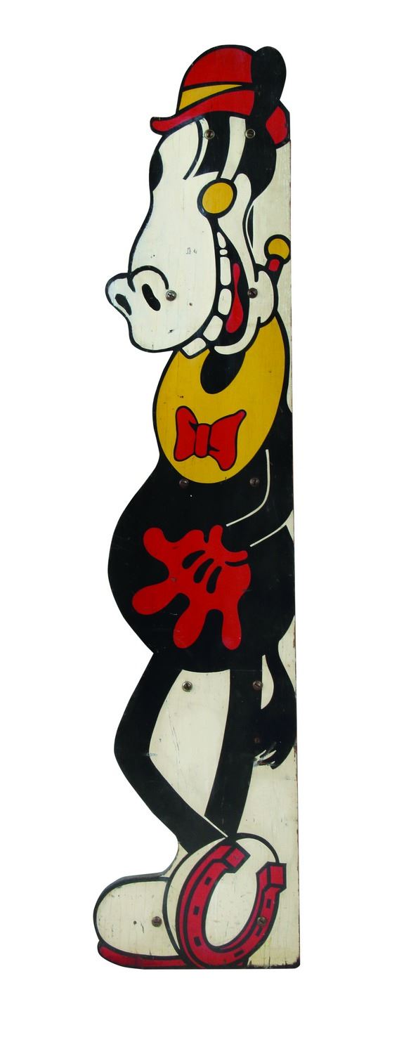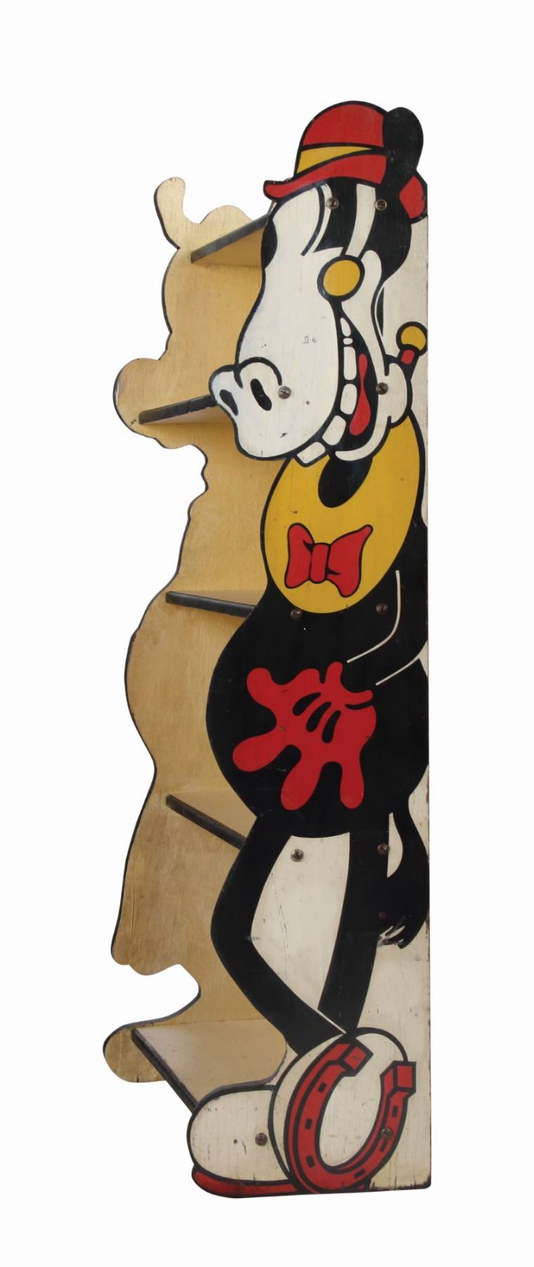 (Kroehler, 1934) An extemely rare hand-painted wooden bookcase featuring large die-cut imagery of Horace Horsecollar and Clarabelle Cow on the left and right sides. The item was manufactured by Kroehler, one of Disney's early licensees. The bookcase measures approximately 21.5" wide, 11.25" deep, and 52" tall. The condition is very good with a few expected spots of paint wear from use.