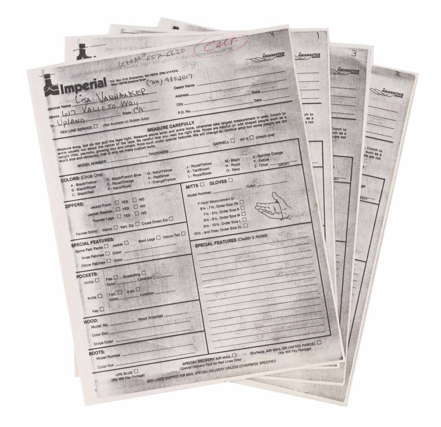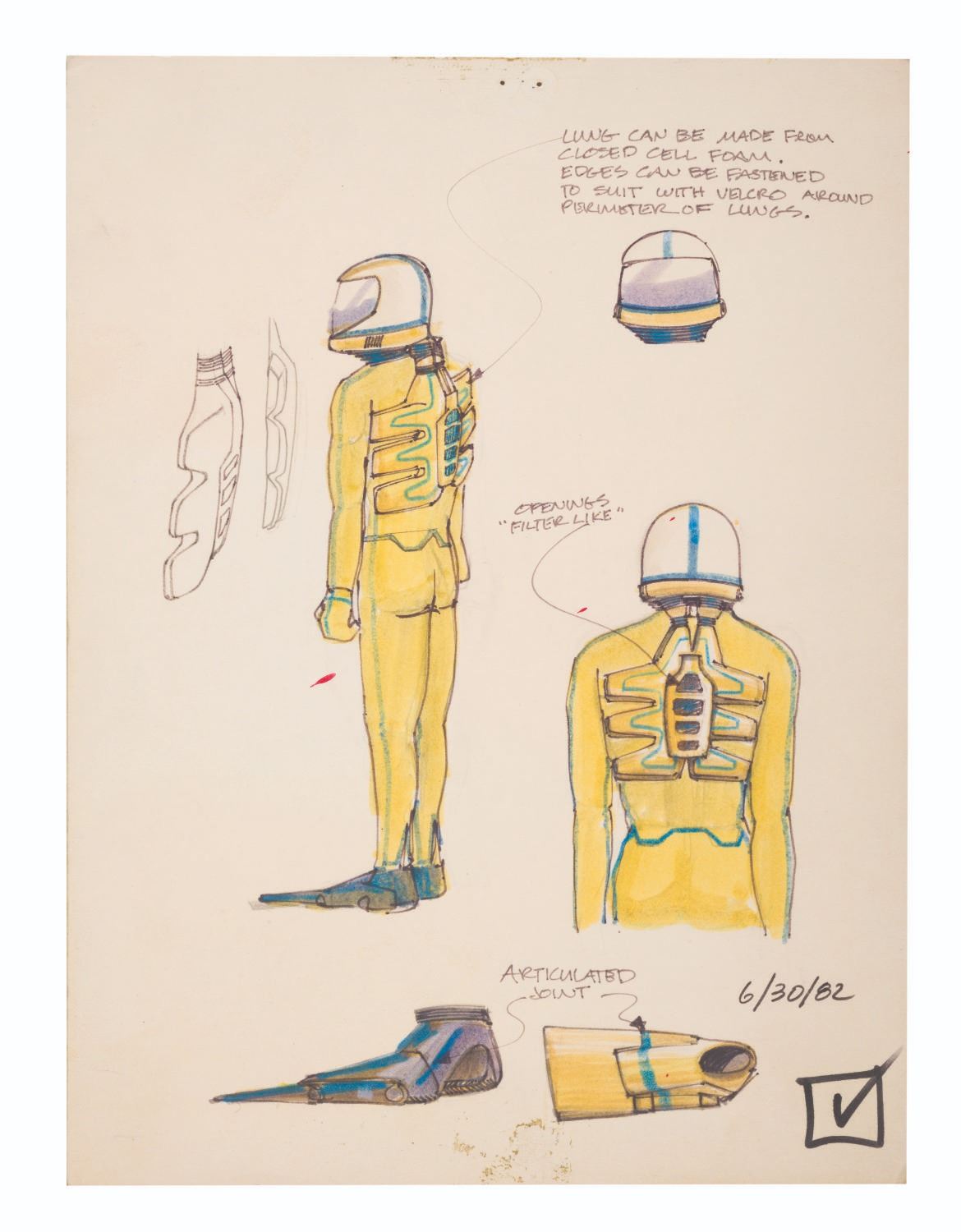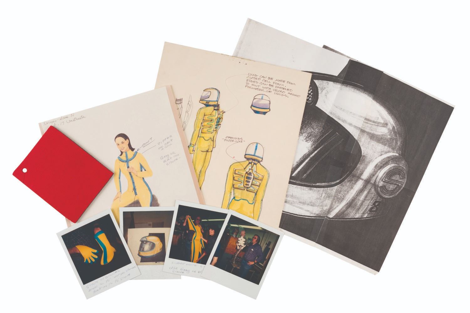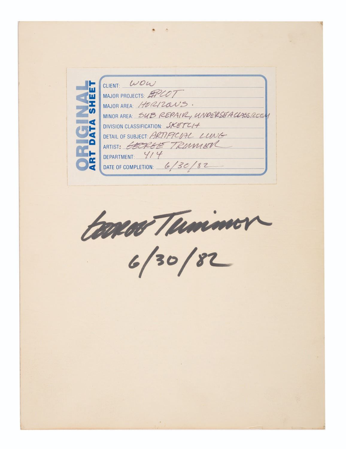 (EPCOT Center, 1982) A collection of concepts and notes for the Sea Castle Resort "Diver" costumes at Horizons. The groundbreaking Future World Horizons attraction at EPCOT Center was the only Disney Park attraction to feature multiple endings - including 31 second films depicting futuristic scenes of fictitious locations: the agro-desert at Mesa Verde, Brava Centauri space colony, and the Sea Castle floating city. This one-of-a-kind collection of original concepts, photo prints, forms, textile samples, and notes was prepared for the attraction's film and show scenes relating to the Sea Castle underwater segments. Notably among this lot is a Diver "Artificial Lung" sketch by artist George Trimmer, an "Instructor" concept approved by the Legendary John Hench, and Aquanatics forms relating to the production of true-life diving suits. Measuring 8.5"x11.75" and various sizes under, each piece is in good to very good condition, with expected fading and wear to edges and corners from handling and age.