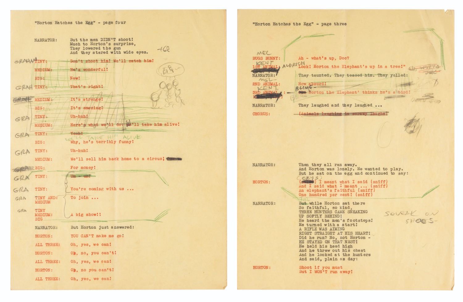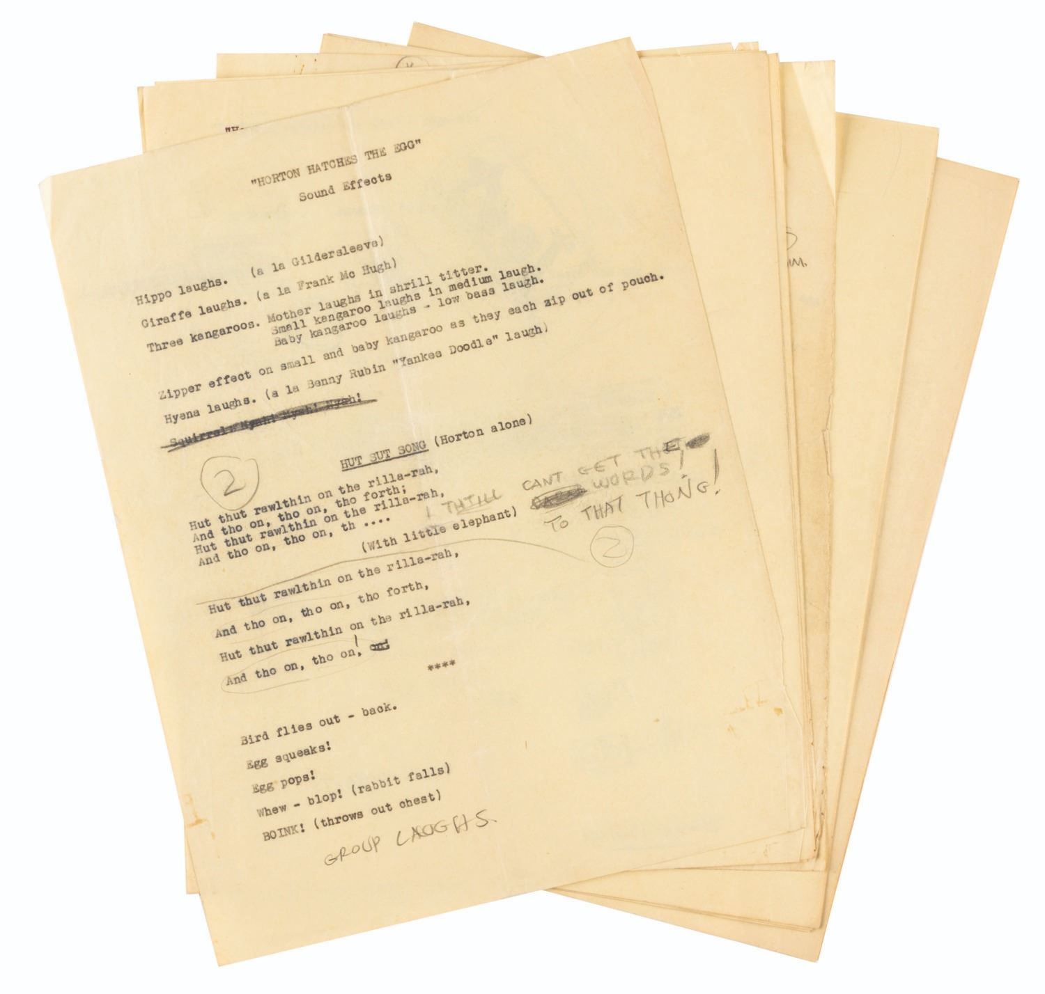 (Schlesinger, 1942) Three production scripts for “Horton Hatches the Egg,” directed by Bob Clampett. Each draft includes handwritten notations by Clampett of dialogue changes and celebrity impersonations for certain lines. Sound effects and Horton’s “Hut Sut” song are listed on a single separate sheet. From four to six pages, the scripts and sound effect sheet all measure 8.5” x 11” and are in good production-used condition with expected handling wear.