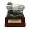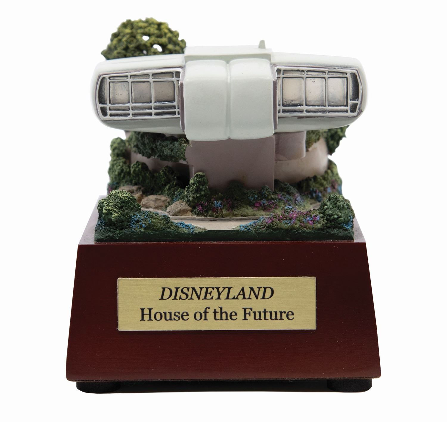 (Disneyland, 2011) An incredible scale model of Disneyland's House of the Future attraction created by Robert Olszewski. This rare replica beautifully recreates the iconic Tomorrowland attraction. Measuring 3.5"x4" and 3.5" tall, the model is in good condition with two very small scuffs on the top of the model. The model also has lighted elements that are battery powered from the base, although the battery compartment has some corrosion from the original batteries and didn't work when tested.