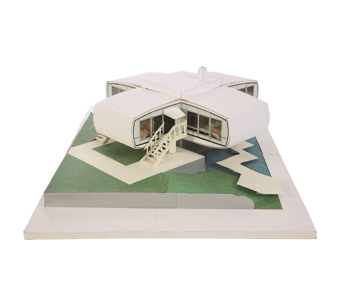 (Disneyland, 1992) Incredible paper model of Disneyland's House of the Future. Artist Ty Ervin was commissioned by the studio in 1992 to build this model for promotional purposes. Constructed of paper and board, the model has incredible detail on both the exterior and interior of the house. Housed in a custom Plexiglas box . Model measures 17.5x23"x8.5". Entire presentation measures 20.25"x30.25"x10.75".