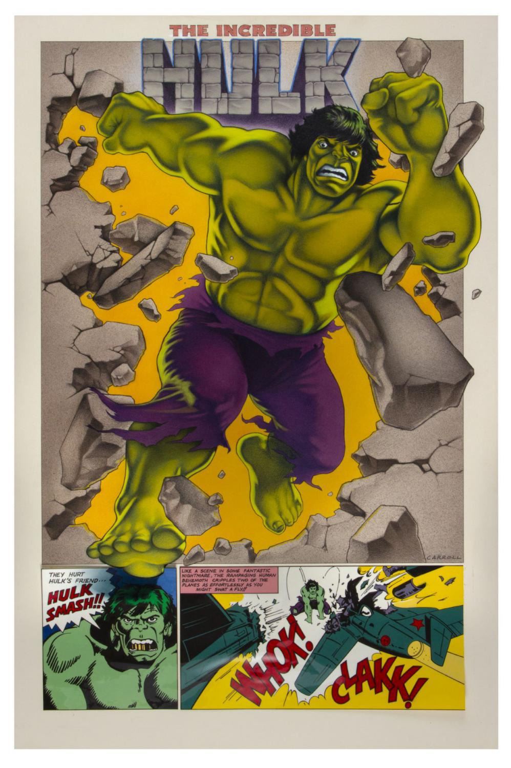 (Thought Factory, 1977) An extremely rare original painting of the classic Marvel Comics superhero "The Incredible Hulk". Painted and signed by artist Justin Carroll, the artwork features a more realistic depiction of the character at top, and a more traditional comic-panel style representation at the bottom. This original artwork was created and used in a popular series of collectible posters that were marketed by a partnership between Thought Factory and Bill Wallen, with this poster coming from Wallen's personal collection. The artwork is composed of primarily airbrush, with the bottom comic-panel artwork created on two clear panels with the black line art on the front and acrylic paint on the back. Measuring 35"x23" on sturdy art board, the original painting is in very good condition with minor wear around the border. The Thought Factory superhero posters were very popular when they debuted in 1977, with surviving examples becoming difficult to find. This is the first time the original artwork for these exceptional posters has ever been offered for public sale, and beautifully represents the legacy of this iconic superhero.
