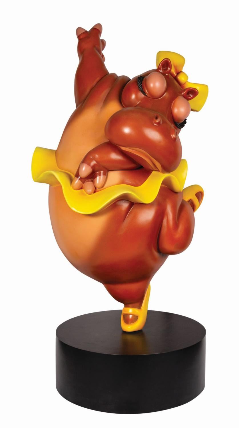 (Disney, c.2000s) A large and impressive Hyacinth Hippo statue attributed to a Fantasia-themed Disney Store display. Constructed of cast fiberglass, the hand-painted, airbrush-shaded figure captures the bulky ballerina in a wonderfully expressive dance pose. The statue is accompanied by a round wooden hollow pedestal base, which conceals a metal pole stand. Hyacinth threads onto the stand via a hole in her foot. The figure measures 48"x30" and is in fine condition with only minor surface wear. The base is 8.5" tall and 24" in diameter with faint wear from use. This item may require special shipping arrangements, please inquire for details and estimates.