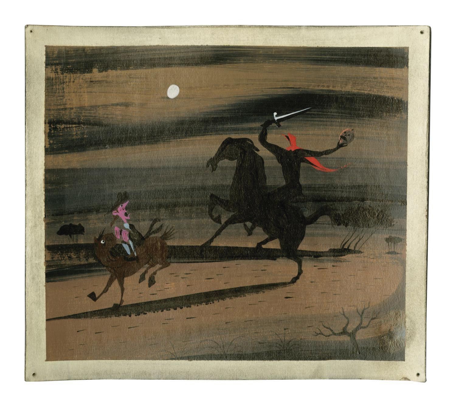 (Disney, 1949) An absolutely stunning original concept painting by Color Stylist Mary Blair. The painting features Blair's vision for a terrifying sequence in which the Headless Horseman pursues Icahbod Crane through the woodside of Sleepy Hollow. The colorful and vibrant piece is accomplished in gouache on artist's board, and has an image size of 8"x 9" on the 9"x10" board. The piece displays in fine condition with a slight curve to the board, pinholes in the corners, and some surface wear.