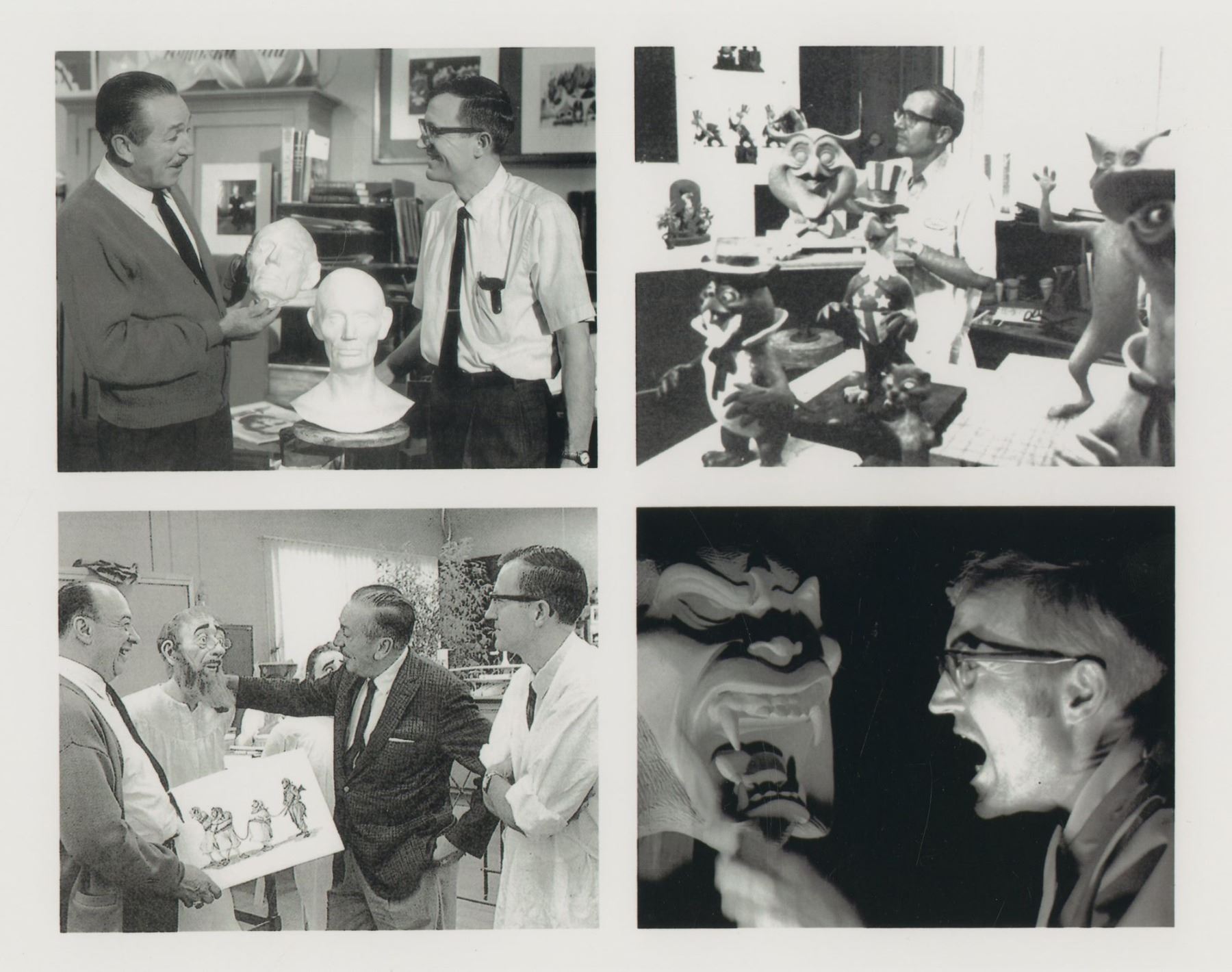 (Disneyland, 1980s) An original print of four Walt Disney Imagineering Audio-Animatronic reference photographs featuring Blaine Gibson. The images show Gibson with Walt Disney and the Audio-Animatronic Abraham Lincoln, with America Sings figures; with Walt Disney, Marc Davis, and a Pirates of the Caribbean Audio-Animatronic; and with the Matterhorn Bobsleds Yeti Figure. Measuring 8" x 10", the glossy 4-up print is in very good condition with light edge and corner wear.