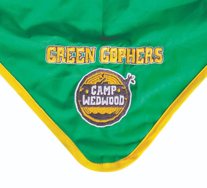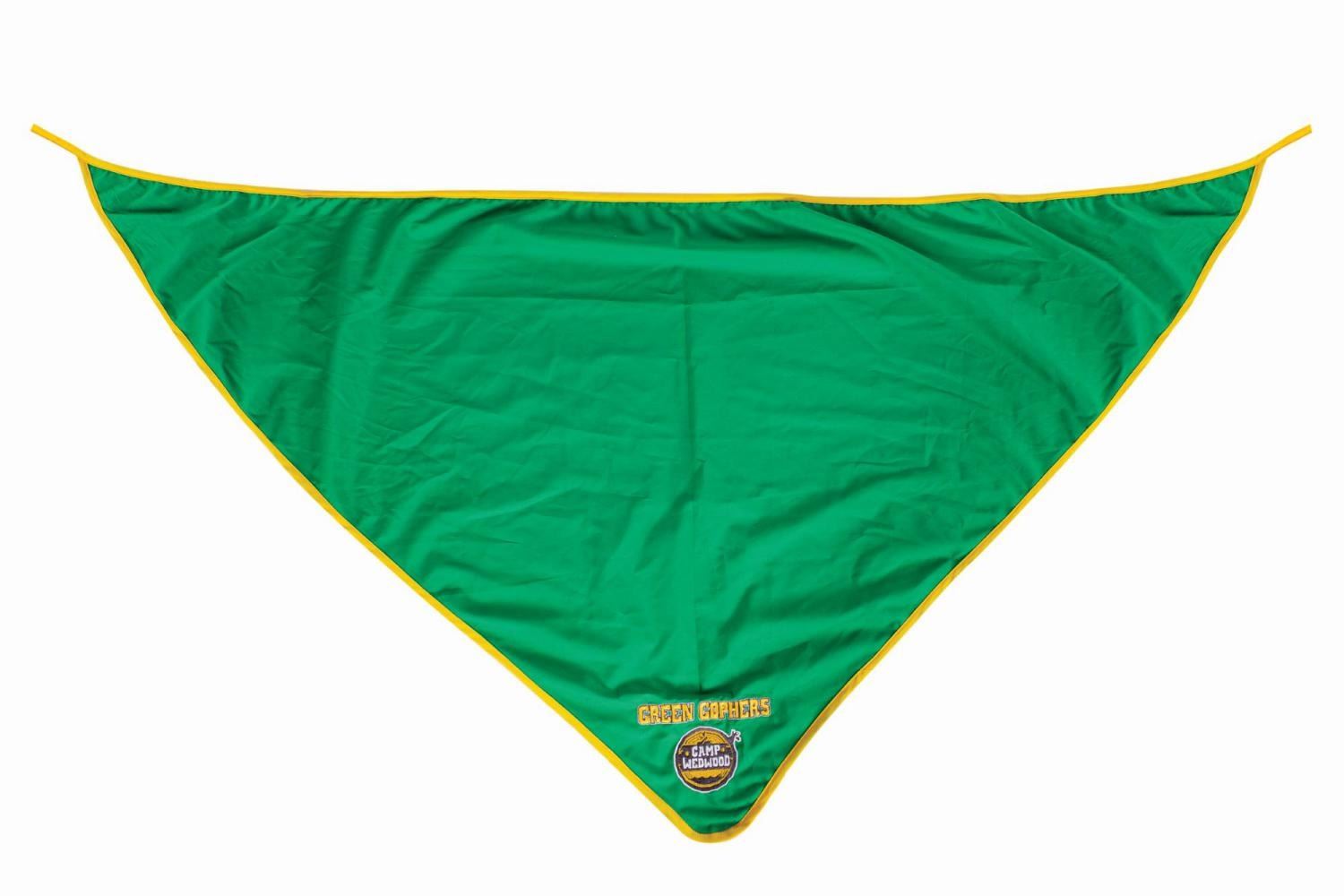 (WDI, c.2000s) A kerchief given to select attendees of a Walt Disney Imagineering R&D summer camp-themed event. The triangular, emerald green scouts-style cloth kerchief features golden fabric piping at the borders with "Green Gophers" and "Camp Wedwood" embroidered patches at the vertex. Measuring 24"x48", the kerchief is in very fine condition with minimal wear.