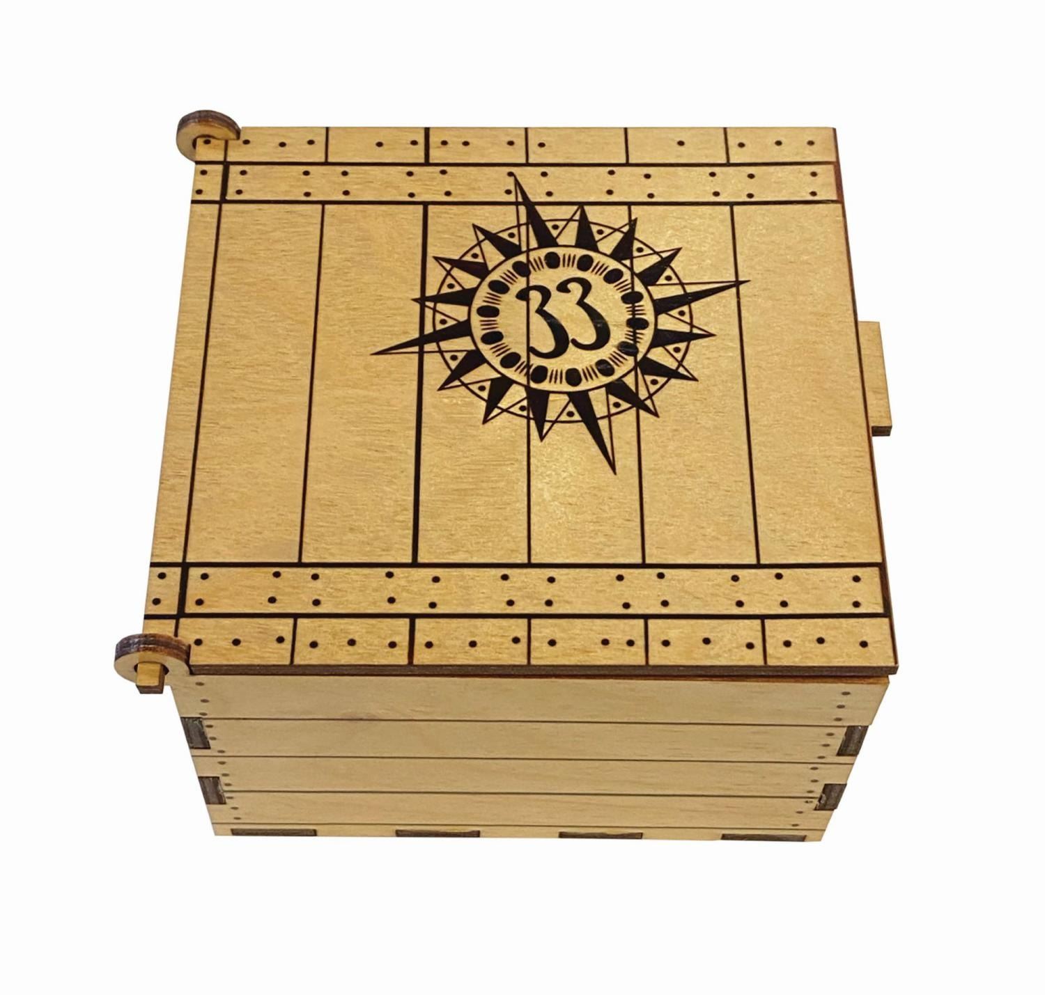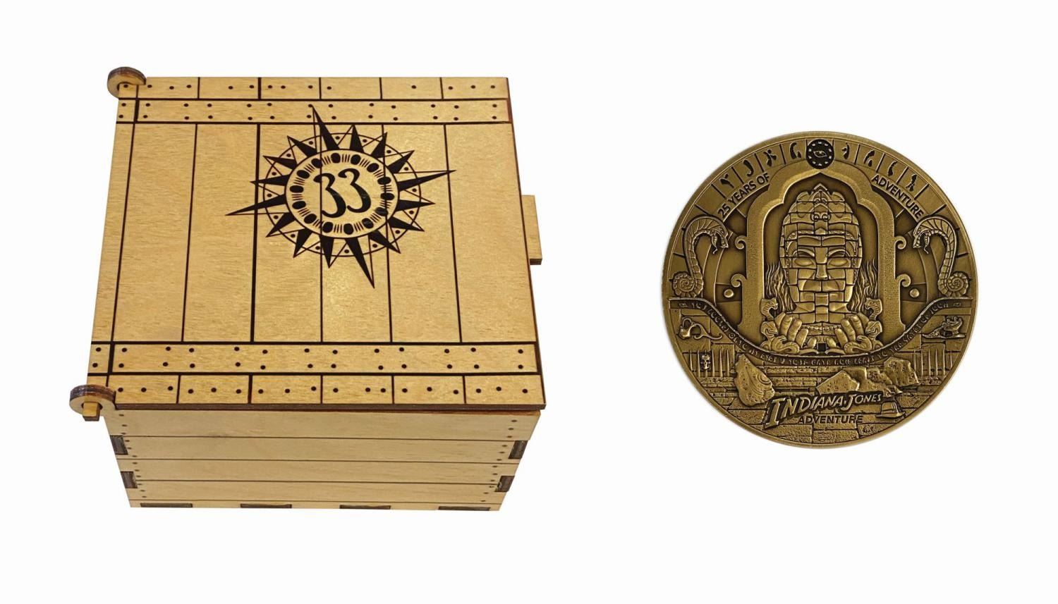 (Disneyland, 2000) A limited edition Club 33 member exclusive medallion commemorating Indiana Jones Adventure's 25th anniversary. Designed by artist M. S. Berman, the antiqued brass medallion features relief imagery of Mara in the Temple of the Forbidden Eye on the face and the Club 33 logo with a skulls and serpents motif on the reverse. Additionally, "Club Thirty Three" is etched into the edge. Created in an edition of 300, the medallion is accompanied by a COA and the original miniature packing crate-style Club 33 box. Measuring 3" in diameter, the piece is in very fine, as-new condition. The box measures 4"x3.75" and 2.5" deep and exhibits only minimal wear.